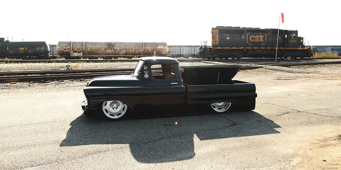 The Apache has a custom chassis designed by Cory himself. He modified the frame with a Camaro clip and built the back half. It has a 114-inch wheelbase with Airlift springs and KYB shocks, front and rear.