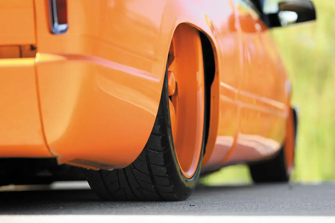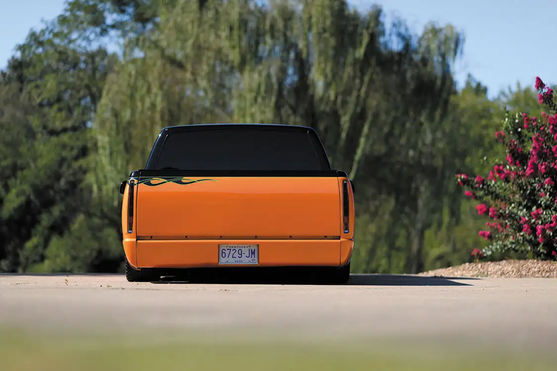This Silverado sports a front grille and headlights from a 2000 Cadillac Escalade, giving it a cool, modern look. The bumpers are from a 2000 GMC Sierra 1500, which adds to the custom vibe. Ben shaved the third brake light and tailgate handle, added Cadillac taillights, and custom rear wheeltubs with a bridge in the bed to clear those big wheels. The truck’s paintjob is unique, with Lamborghini Arancio pearl orange Tricoat layered in black pearl, and all PPG paint applied by Ben and Heath.