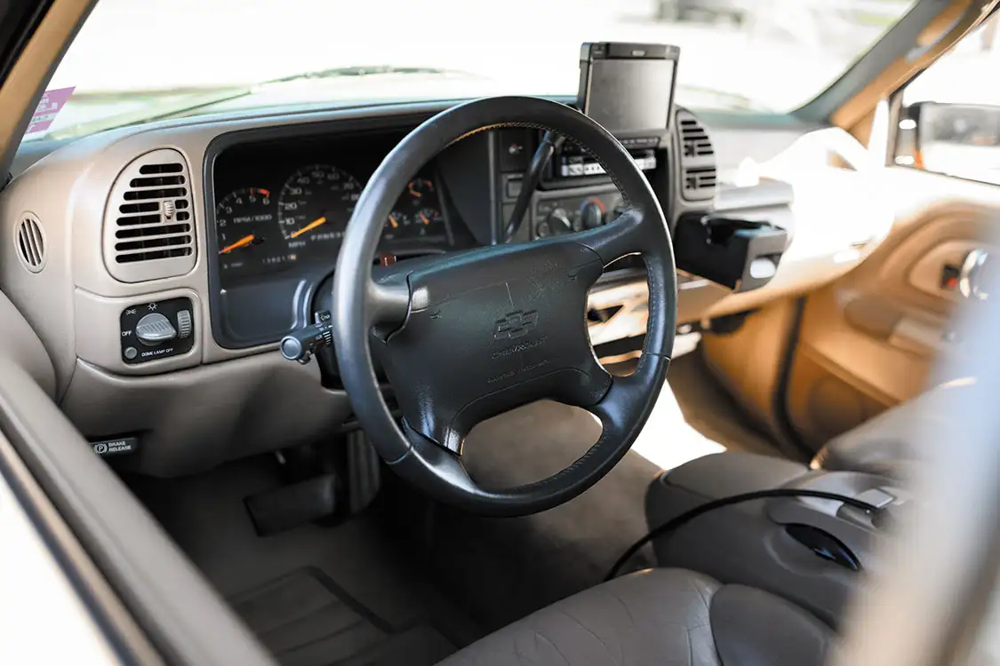 Ben’s Silverado features a 12-inch rear notch to clear the larger wheels, and is sitting on full air ride with air bags and suspension components. The front brakes are stock, but the rear has a disc brake conversion from Little Shop Manufacturing, ensuring it stops as well as it goes.