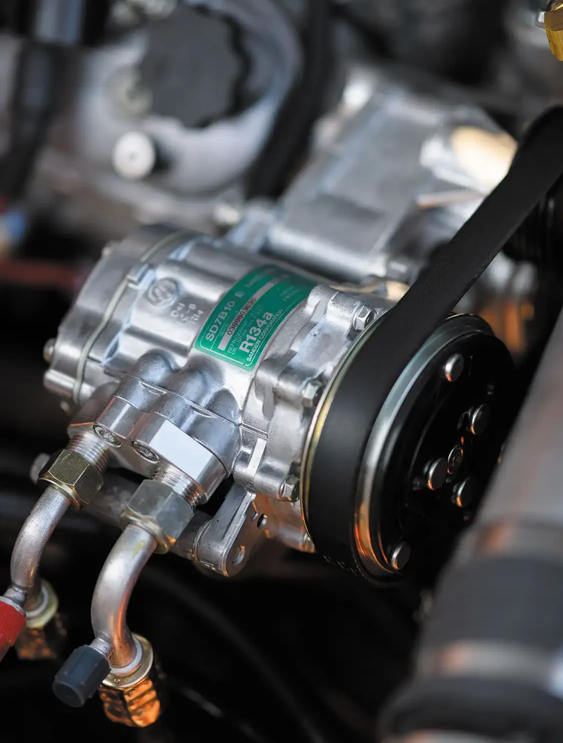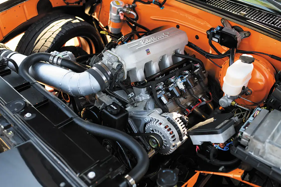 Under the hood, you’ll find a 5.3L LS engine from a 2001 Chevy V-8. This OBS engine fits perfectly thanks to Dirty Dingo motor mounts, and looks clean with the performance front pulley accessory drive system, and a BTR Norris camshaft with a 212/22X lift and .552 inch duration. The Edelbrock LS Pro-Flo intake manifold, Speed Engineering 1 ¾-inch headers, and 2 ½-inch exhaust system give it the roar it deserves. The transmission is a GM460E with a 2800 stall speed, keeping everything in check.