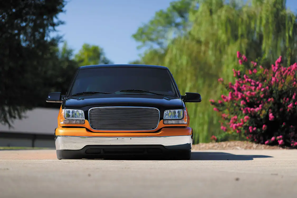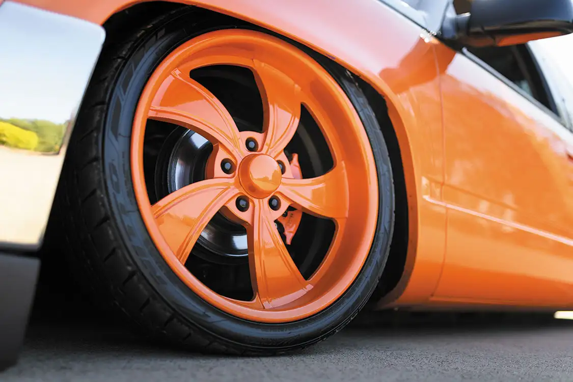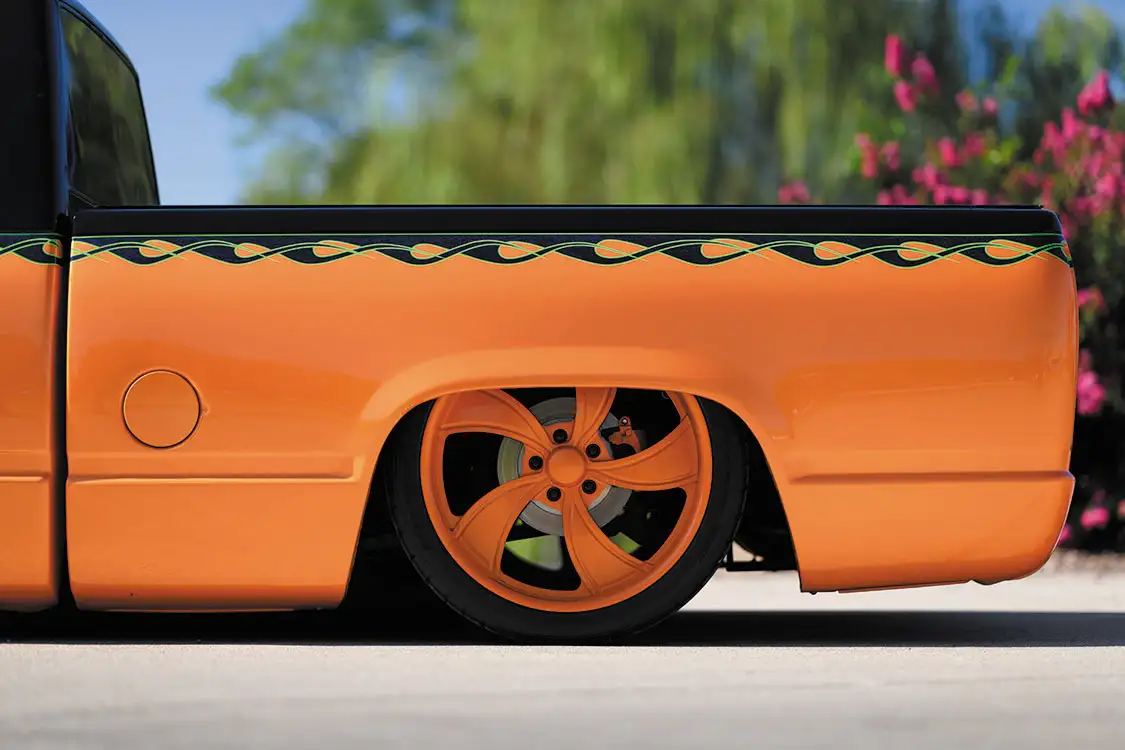This Silverado sports a front grille and headlights from a 2000 Cadillac Escalade, giving it a cool, modern look. The bumpers are from a 2000 GMC Sierra 1500, which adds to the custom vibe. Ben shaved the third brake light and tailgate handle, added Cadillac taillights, and custom rear wheeltubs with a bridge in the bed to clear those big wheels. The truck’s paintjob is unique, with Lamborghini Arancio pearl orange Tricoat layered in black pearl, and all PPG paint applied by Ben and Heath.