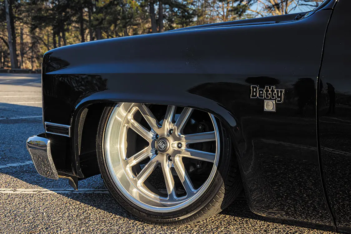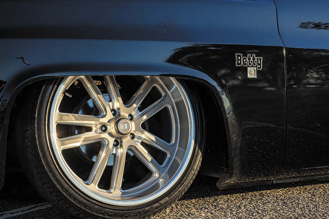 Ensuring optimal air supply, two Viar 485 compressors work in tandem to keep the air tanks fully pressurized. Speaking of tanks, Betty boasts two FLO 24-inch billet air tanks, providing ample air storage for on-the-go adjustments. Managing the entire air suspension system is the Air Lift Performance 3H management system, offering precise control over ride-height via preset height settings. Complementing this well-engineered chassis setup are the striking US Mags wheels, sized 22×9 in the front and 22×11 1/2 in the rear, adding both style and substance to Betty’s overall performance and aesthetics.