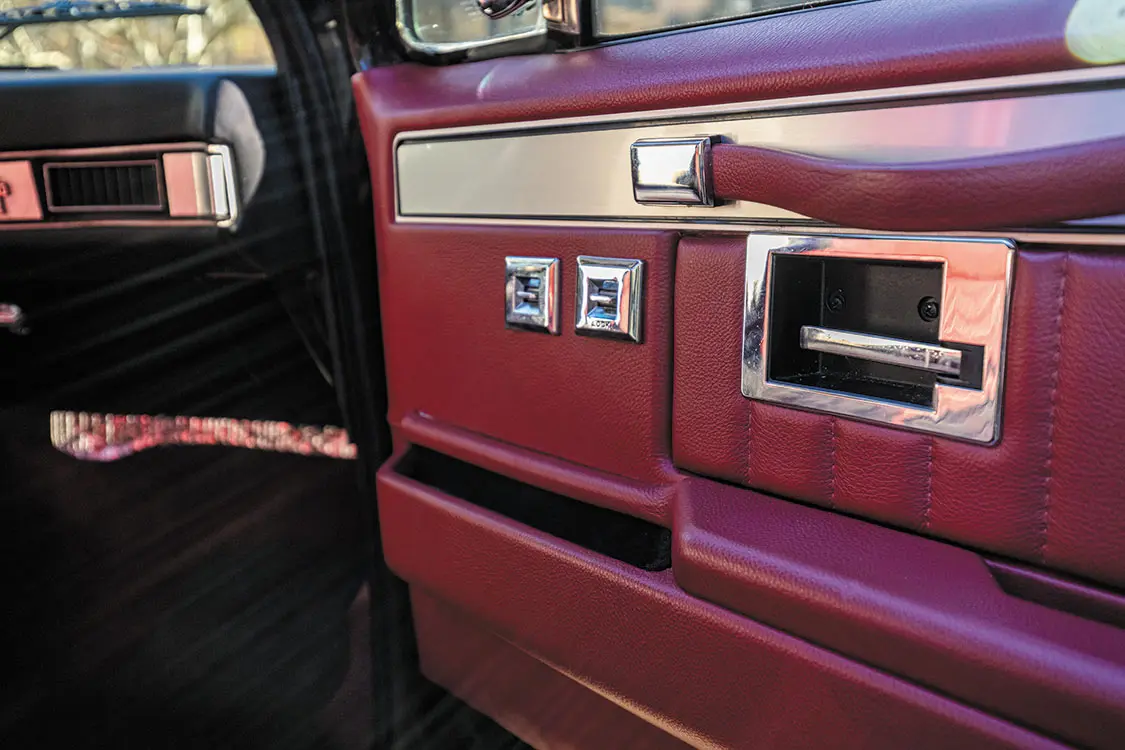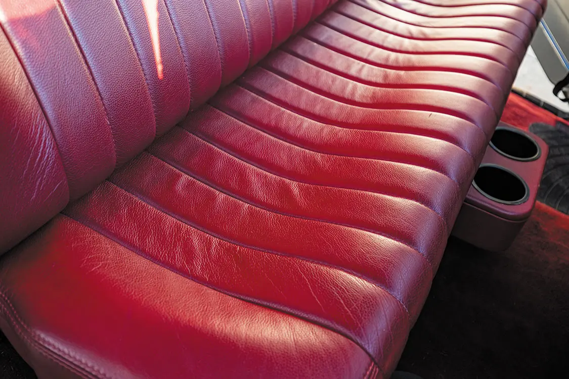 • Custom one-off door panels and bench seat built by Cato’s Custom Upholstery