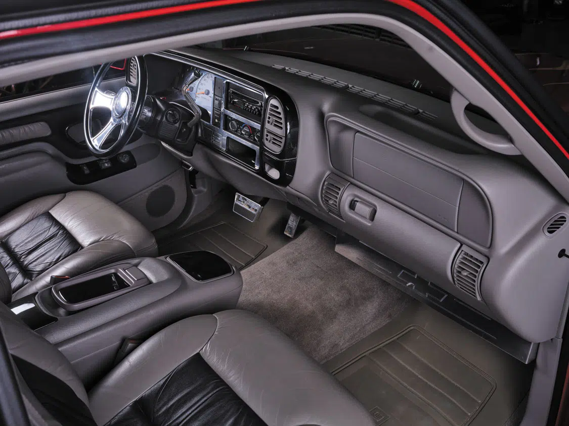 Since Billet Specialties offers much more than wheels, a wide assortment of dress-up hardware was peppered throughout the engine bay. The billet parts that were put into place came very close to outshining the Whipple supercharger that was planted atop the 5.7L engine, but they perfectly complement its presence underneath the hood. The same methodology was used inside the cab as well with the inclusion of a Billet Specialties’ steering wheel, column shifter, gauge and dash bezels, pedals, and other accessories that were designed to take ’88-’98 trucks to elevated levels of customization.