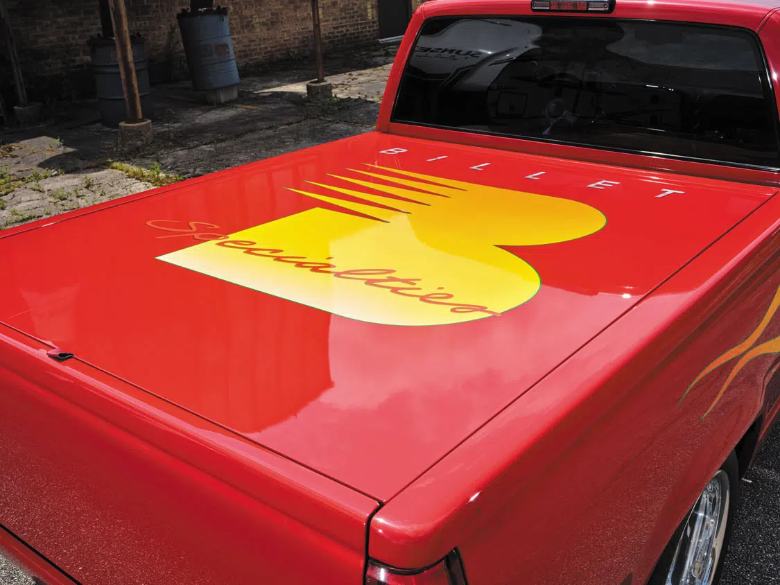 The next phase of the project was to settle on how to create an eye-grabbing paint job. Since these trucks were being approached as modern day hot rods during that time, nothing less than a red-hot, traditional-style flame job would do. Soncy Road Body Shop’s own custom-mixed red served as the base, and once the flames were applied to the surface, Mark then proceeded to add a full-size Billet Specialties logo on the bed cover to fully allow this truck to make its mark once it hit the show scene.