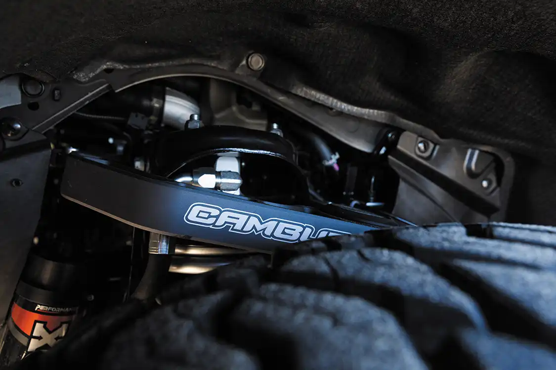 Suspension: Front: Fox Performance Elite 2.5-inch DSC Evo coilovers, Rear: Fox Performance Elite 2.5-inch DSC Evo shocks, Rear Coils: Eibach 16-inch tall / 3-inch diameter springs (350-lb), Upper Control Arms: Camburg front billet upper arms, Rear Trailing Arms: Camburg rear billet trailing arms
