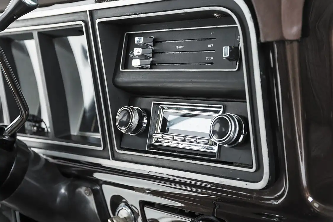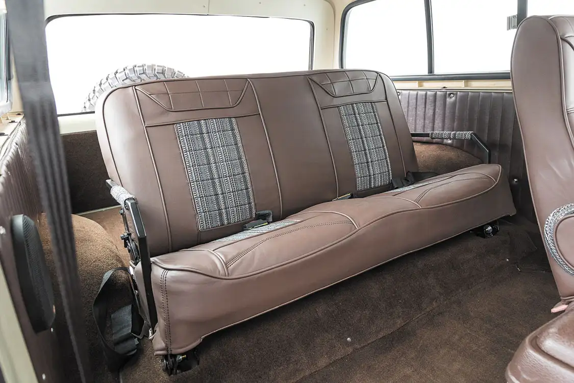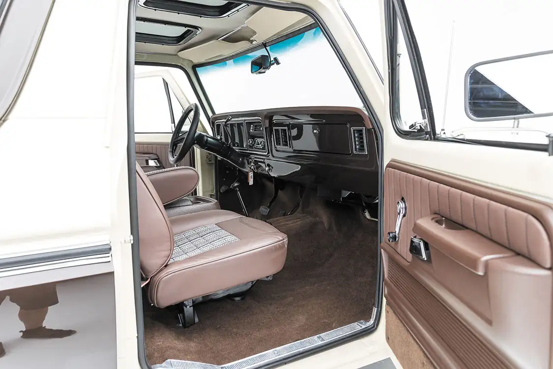 Speaking of the in-cab scene, Adam looked forward to increasing its appeal from the day he bought the Bronco. To get that planned rolled out, he first reached out to McCall’s Upholstery in McCall, Idaho, to recover the front buckets and rear bench seat with leather skins and cloth inserts to create a familiar vintage appeal. Fresh paneling and carpeting were also thrown into the mix for an overall cleanly appearance. To properly fill the cab space with pure audio bliss, Adam wired up a RetroSounds head unit, and connected new speakers in the front doors and rear door panels as well as a subwoofer to hit the low notes.