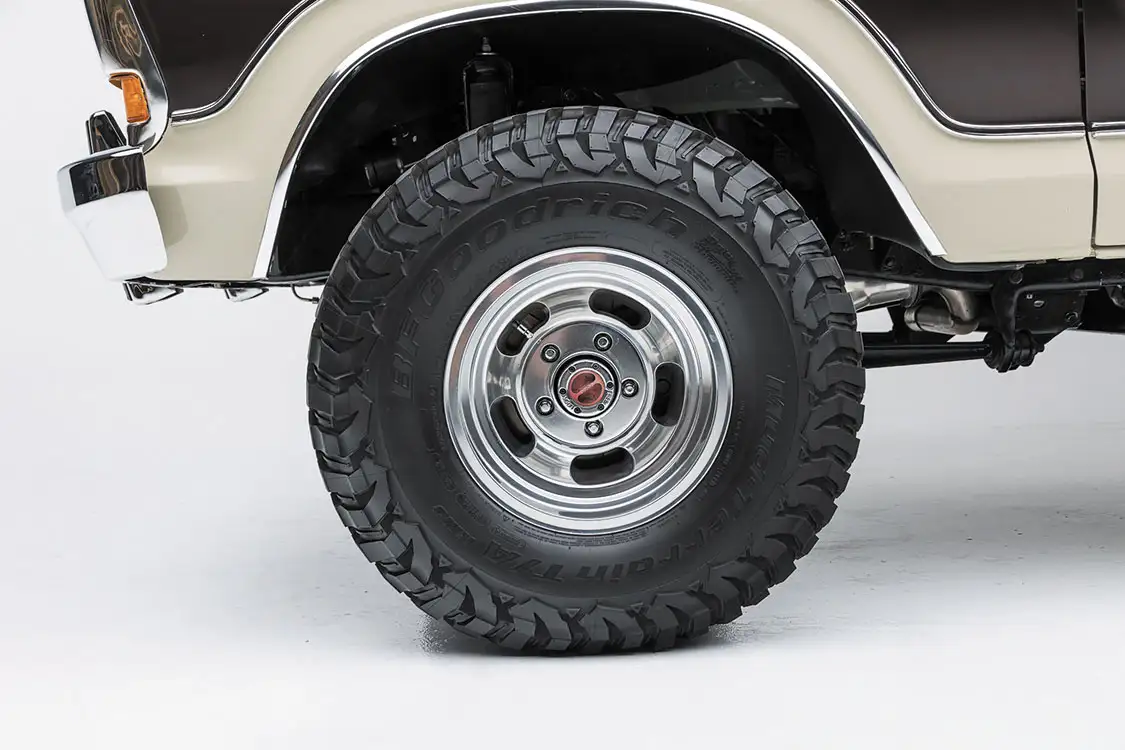 With the Bronco quickly taking shape, Adam kept the progress rolling by focusing on increasing its off-road prowess. While he would be the first to admit that this machine was always destined to be more of a “garage queen/nice day cruiser,” Adam didn’t suppress his vision to increase its ride height and then some. A Wild Horses 4×4 2.5-inch lift kit provided enough of a change in altitude to bring a smile to his face, which cleared more than enough room for a fresh set of 15×10 US Mags “Slot” wheels wrapped in 33×12.5-15 BFG rubber. To bring the Bronco to a steadier halt, disc brake upgrade kits were also included in the growing list of premium amenities.