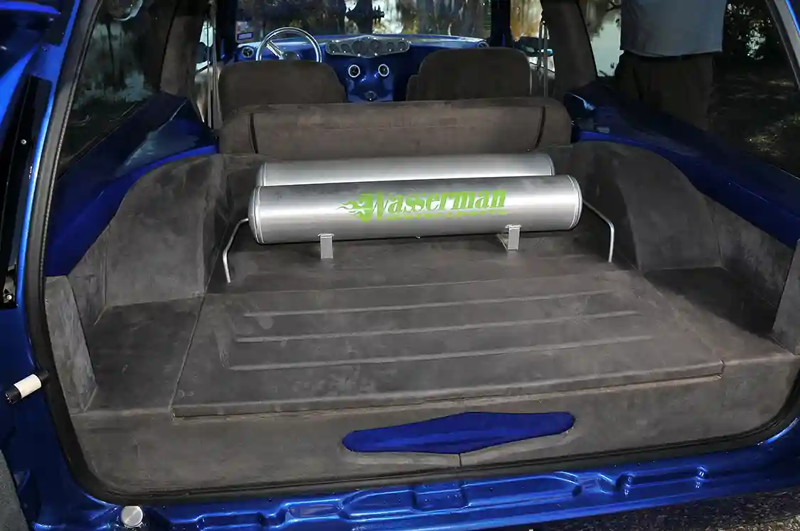 Two custom spun aluminum 12-gallon air tanks plumbed through rear cargo door