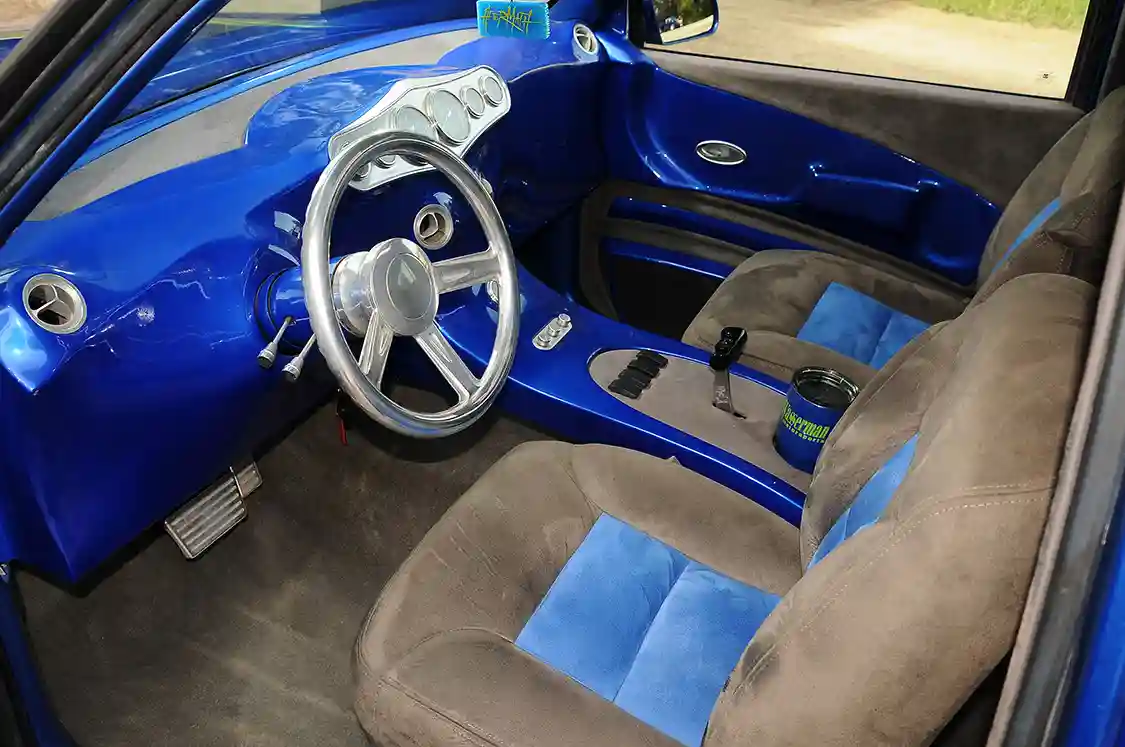 Upgraded front clip, hood cut and sectioned from ’96 to ’06 front end, body lines on doors and rear adjusted to ’06 style, barn door hinges relocated to inside, rear lights filled, welded, and relocated to rear pillar