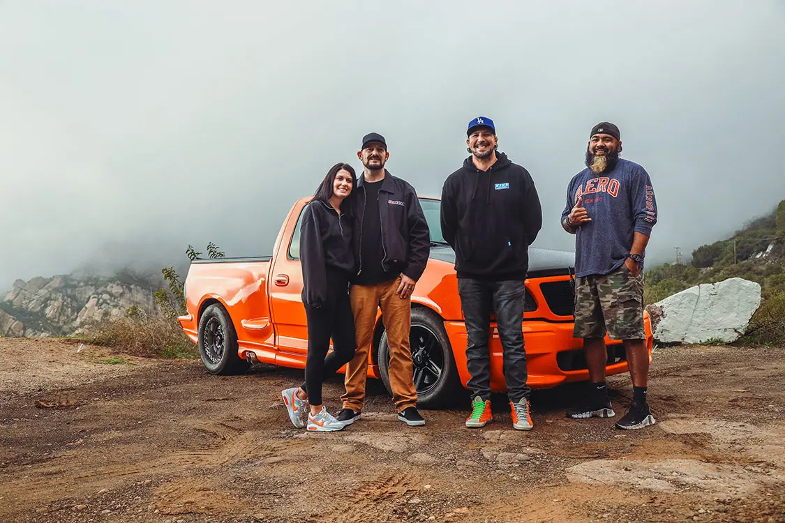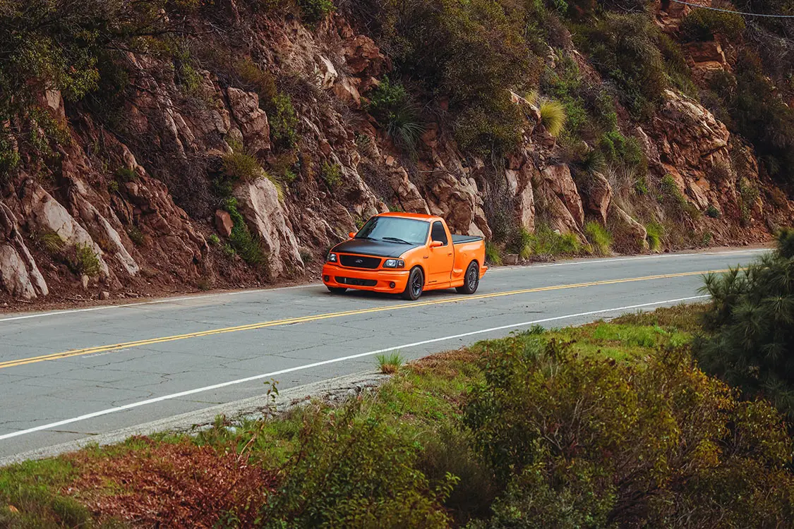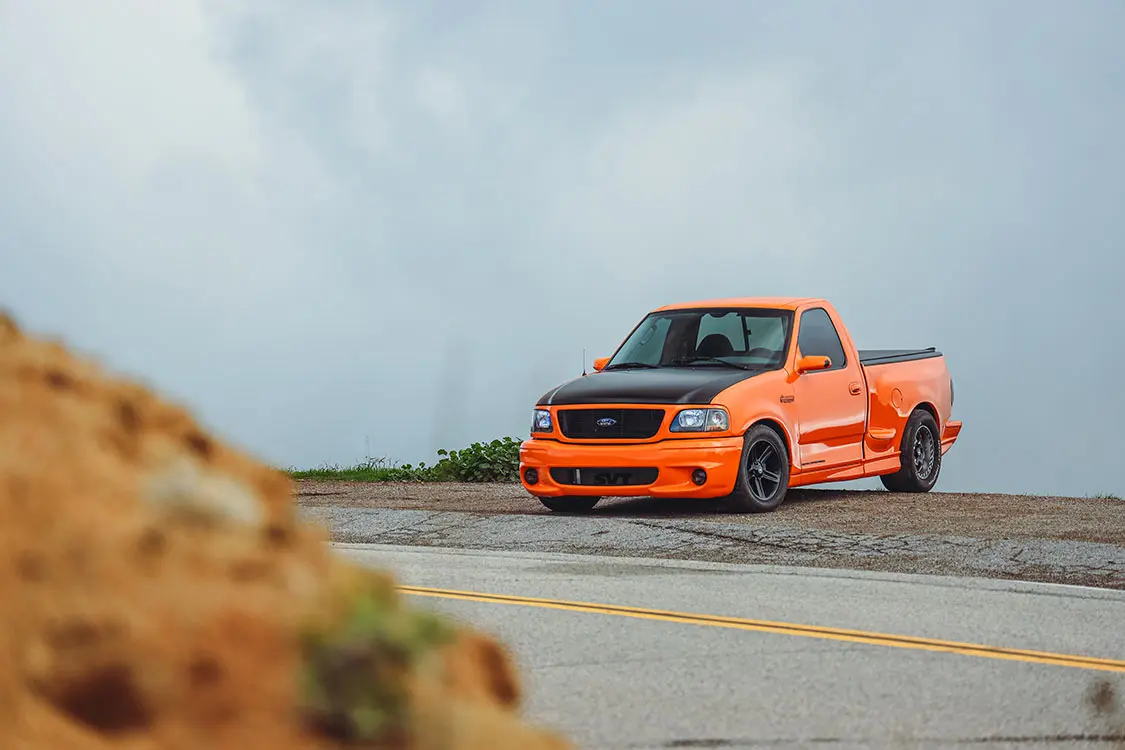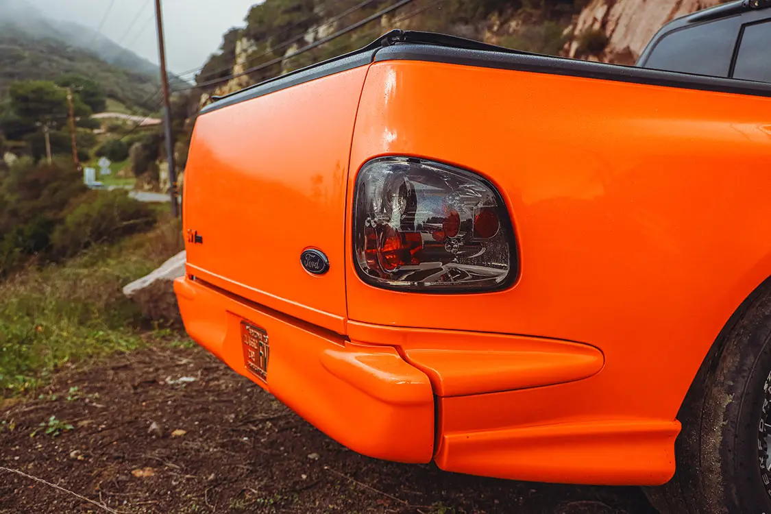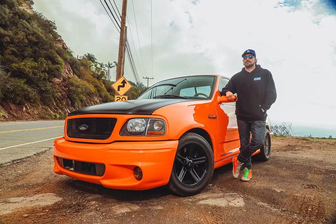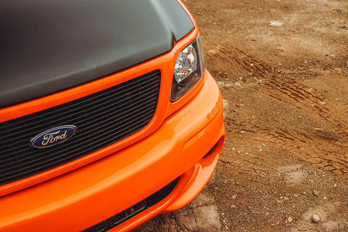We were lucky enough to collaborate with Brendan to document the addition of some power adders that would reengineer his Ford Lightning with speed in mind. The first step was taking it to DWraps in Simi Valley, California, to fully wrap the truck in a vibrant orange vinyl with a sleek black hood—a striking combination that set the scene for what was to come.