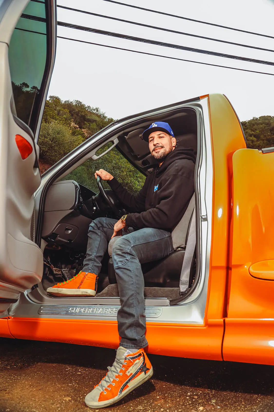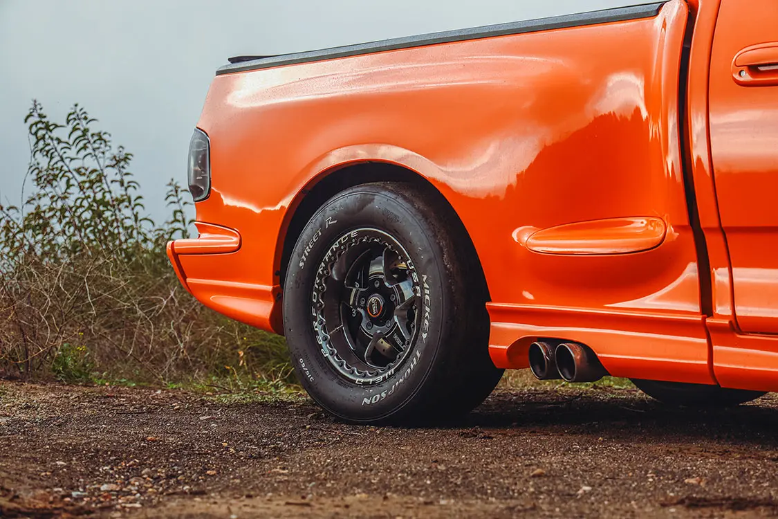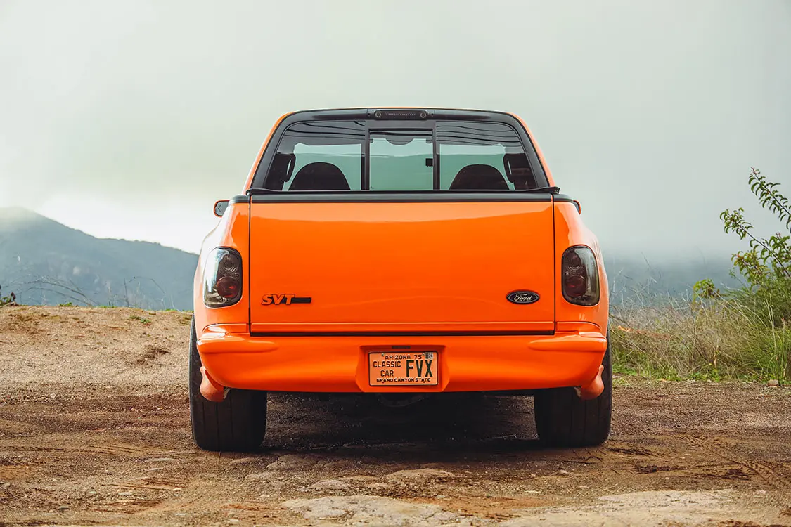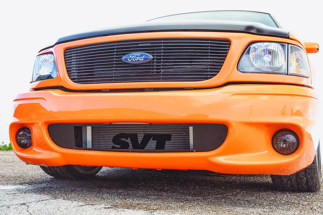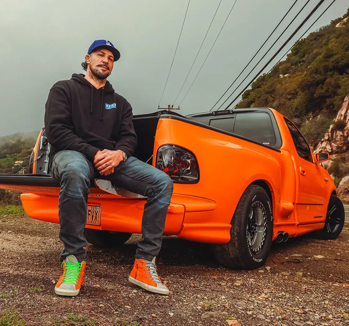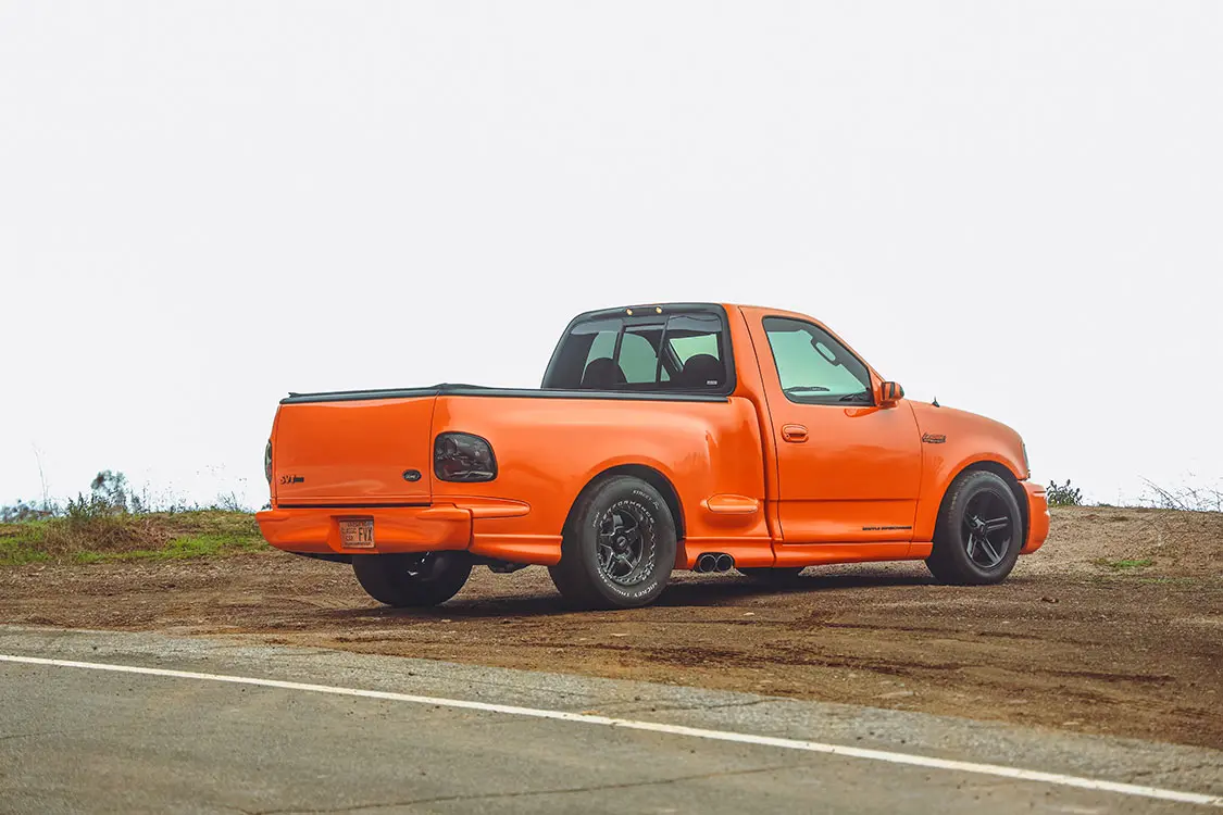 We were lucky enough to collaborate with Brendan to document the addition of some power adders that would reengineer his Ford Lightning with speed in mind. The first step was taking it to DWraps in Simi Valley, California, to fully wrap the truck in a vibrant orange vinyl with a sleek black hood—a striking combination that set the scene for what was to come.