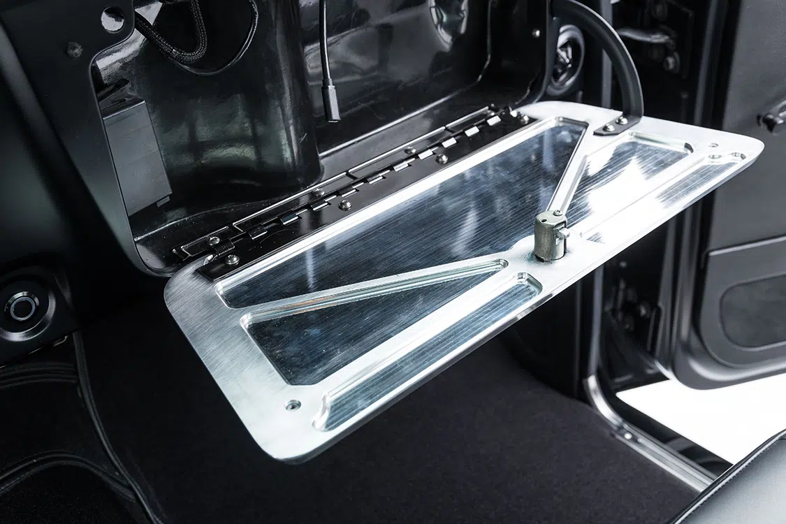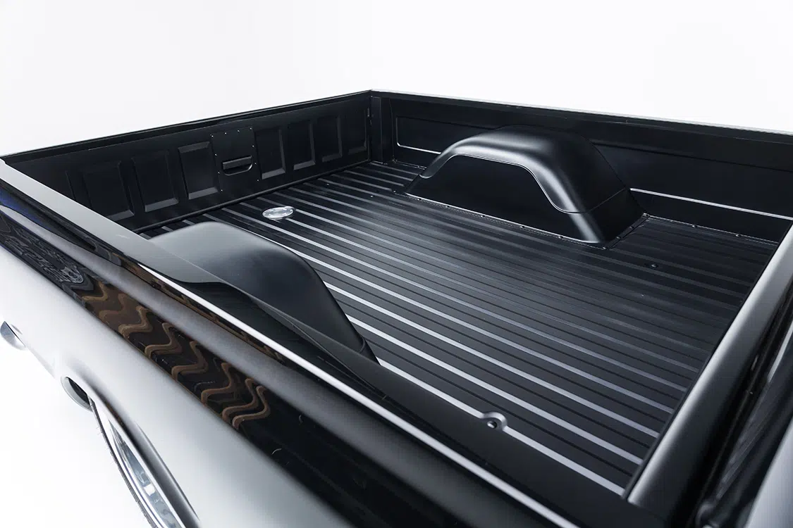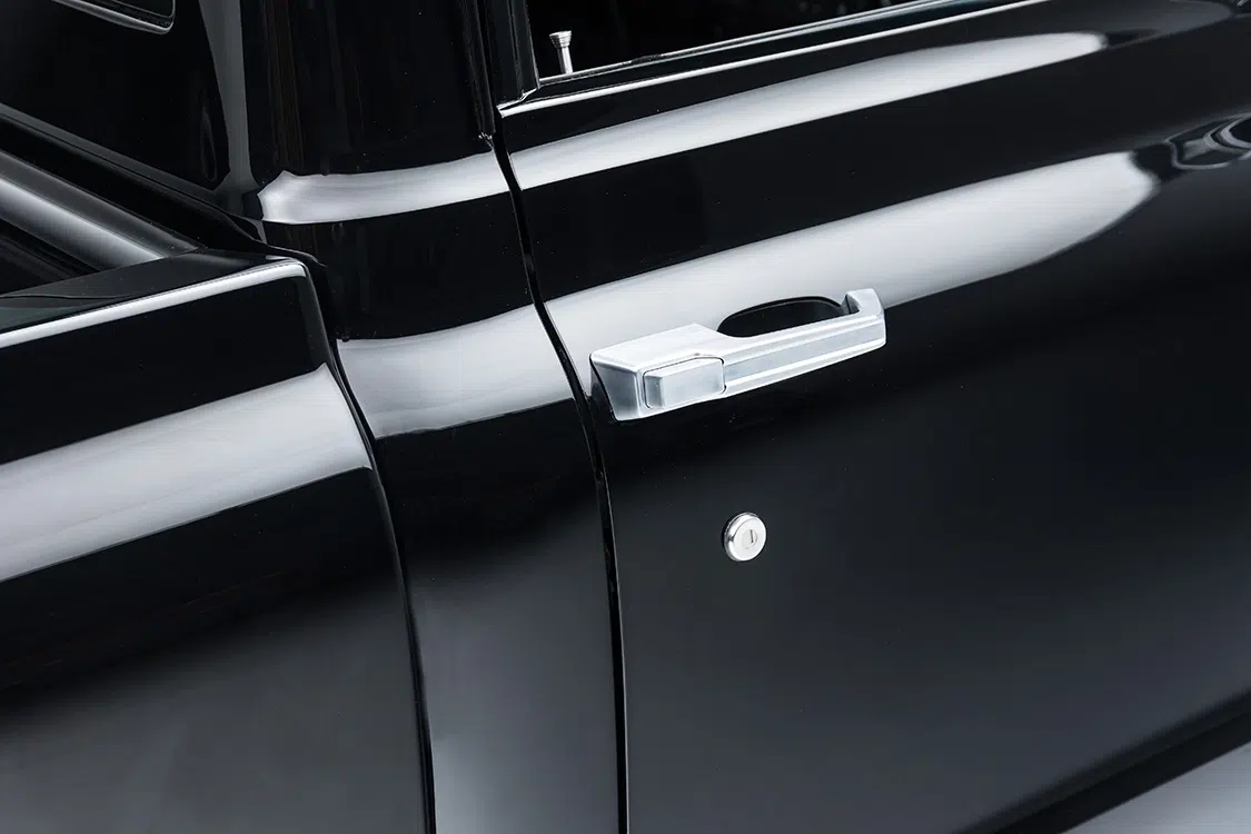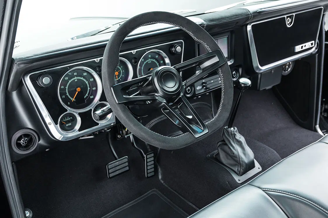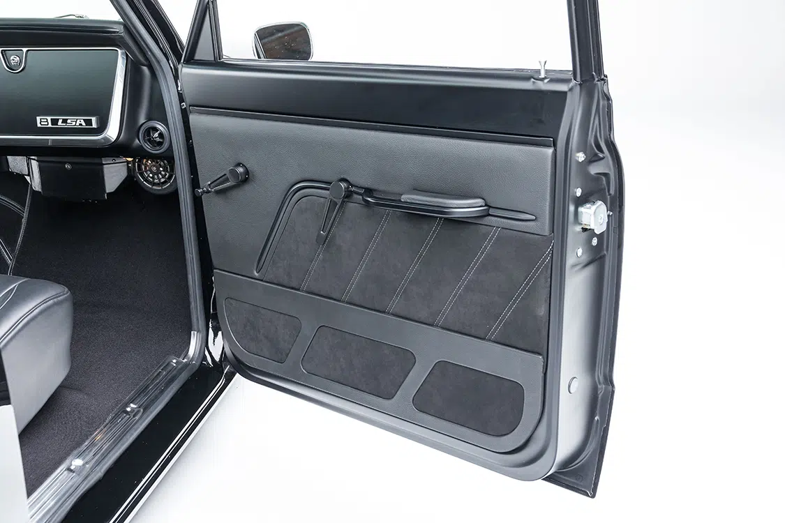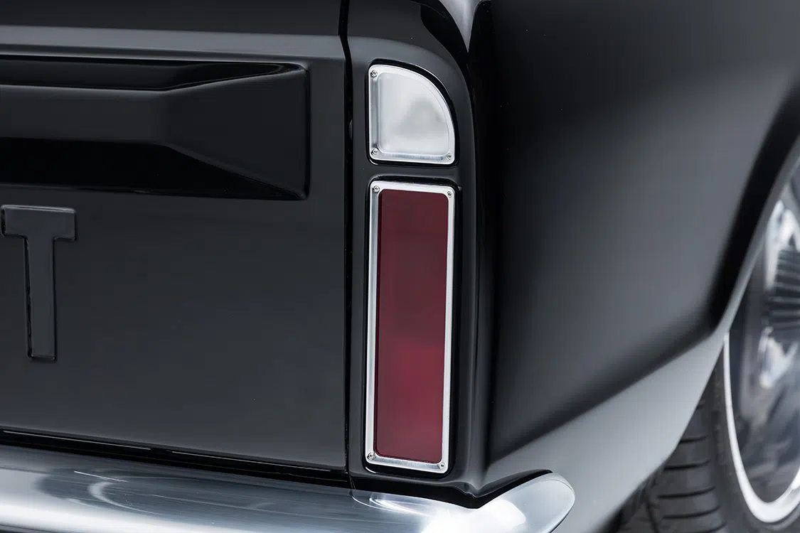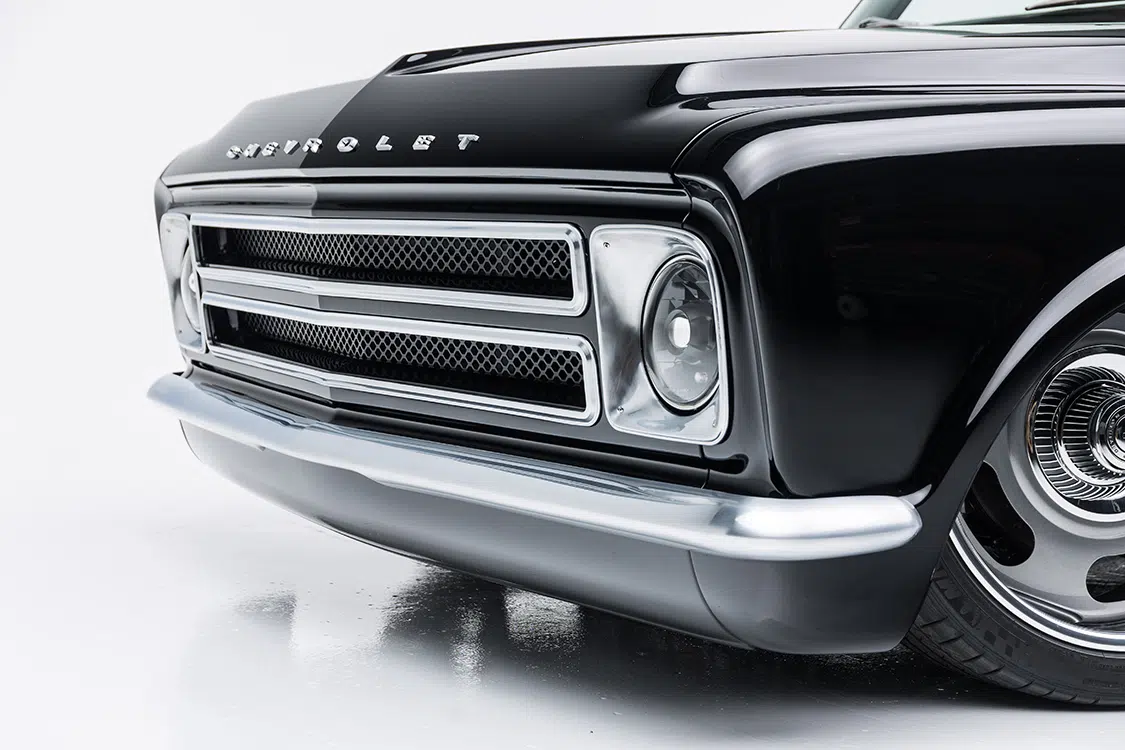 With the underpinnings and engine ready to go, it was time to start on the body. The bed was sectioned and raised 5 inches while keeping the factory lines all the way around. A roll pan was added and the tailgate handle and gas cap were relocated. Side markers were shaved for a cleaner look while the Delmos door handles and a first-gen Camaro front bumper were added for a completely different look. Up front, the factory grille received BNCO inserts and Dapper 7-inch LED headlights with integrated turn signals. Slosh Tubz in the front and AMD rear tubs ensure the tires are covered as well. Once all the metal work was massaged to be laser straight, the PPG single stage black paint was sprayed. Jeff Reed, Chris Mull, and Jose Ortiz at Treasure Valley Street Rod in Boise, Idaho, handled the flawless work on the body.