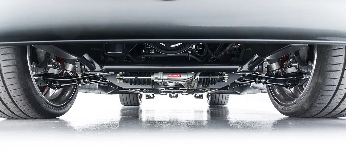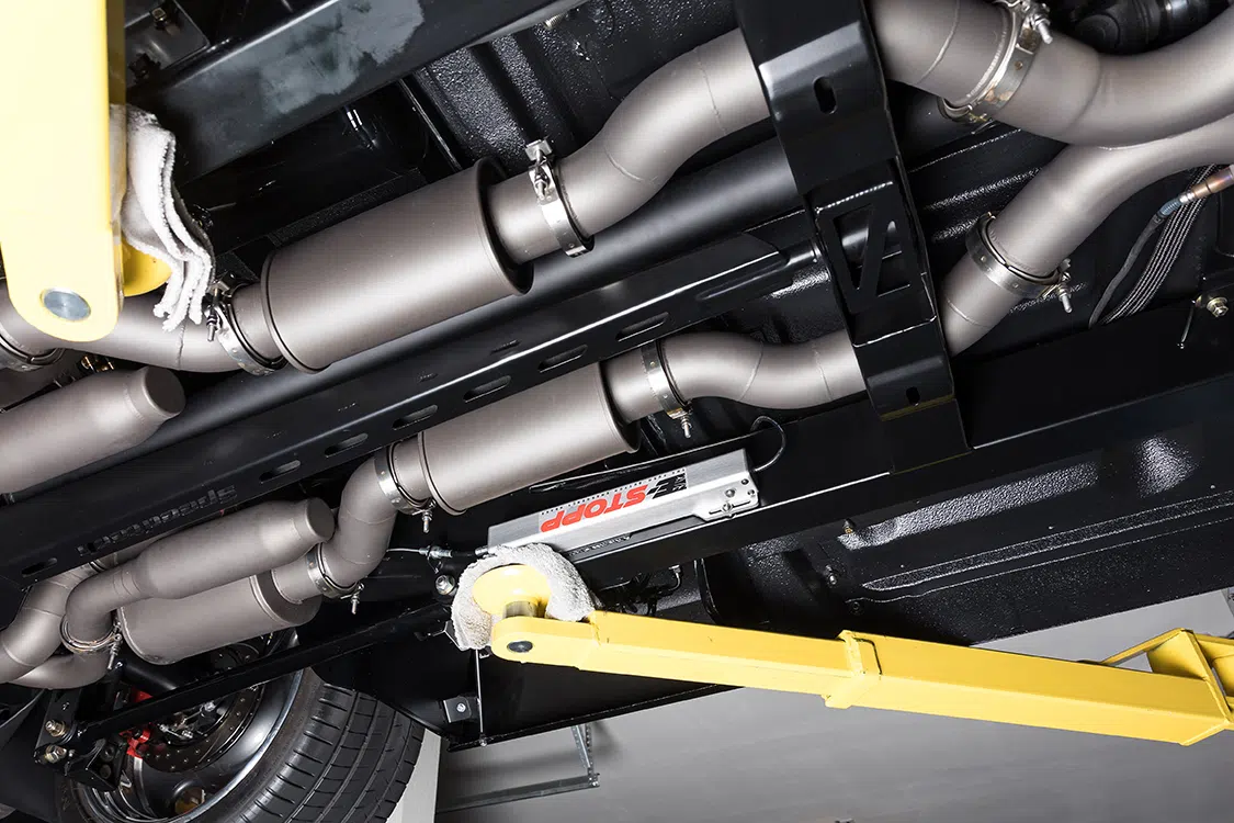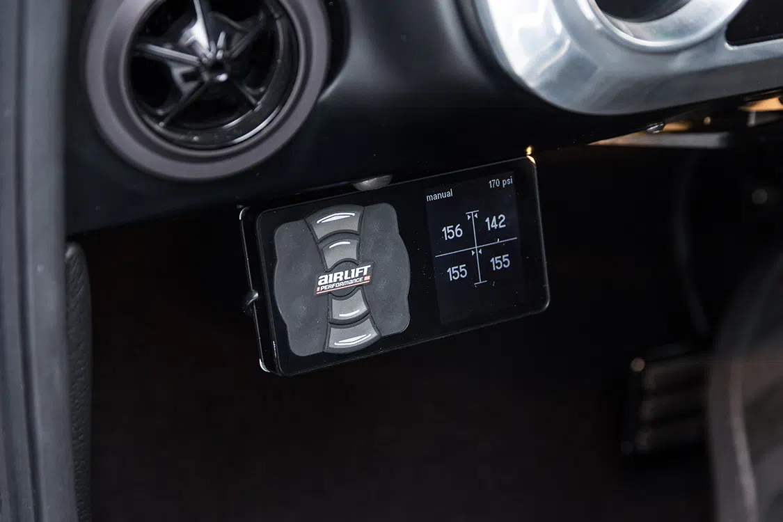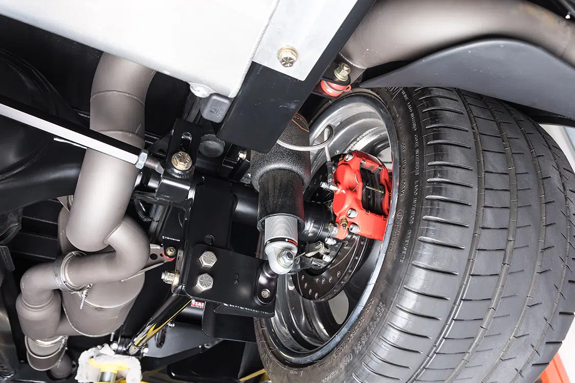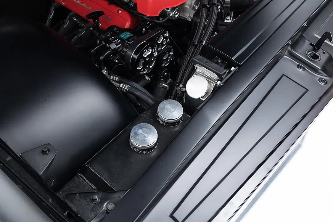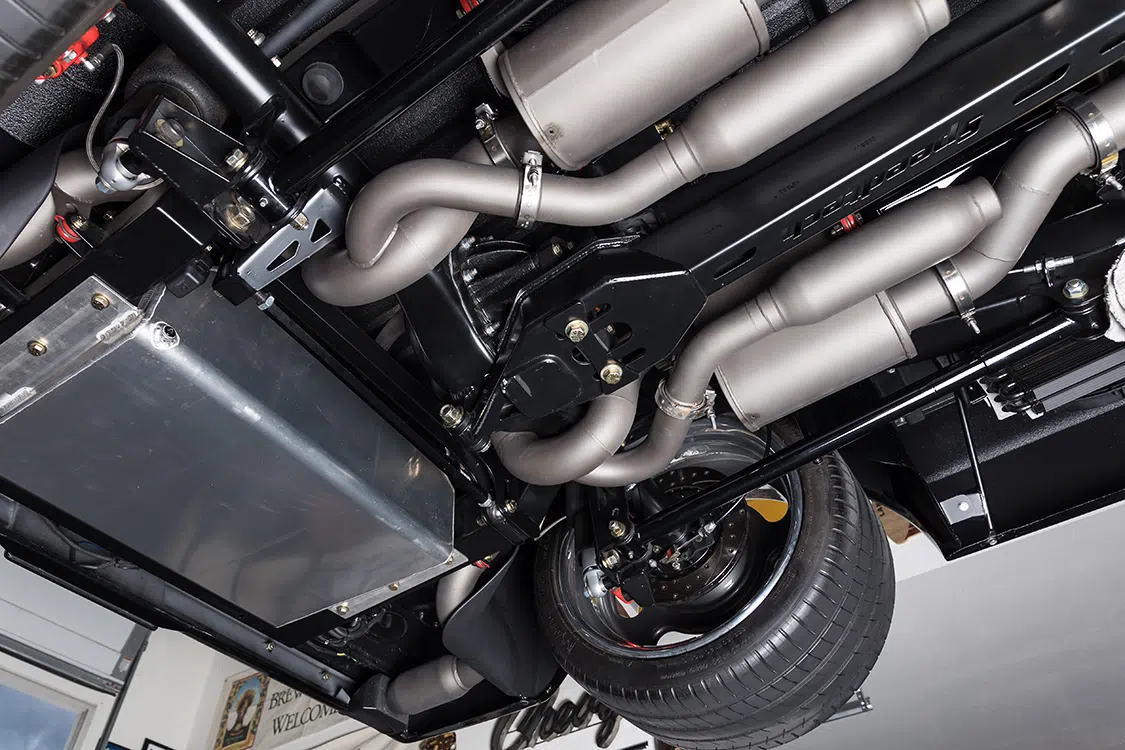 After deciding that a short wheelbase chassis from Speedtech would be the route to take, Brandon got with Mar McIver at McIver Custom Fabrication in Meridian, Idaho, to handle this task. But first, the chassis and parts were sent to JB Laser in Boise, Idaho, to lay down the powdercoating. The new chassis rides on Ridetech 5-inch Shockwaves in the front and 4-inch Shockwaves in the rear—all controlled by two Viair compressors. To complete the rolling chassis, staggered 20×10 and 20×12-inch US Mag Big Slot wheels were added. The new wheels were wrapped in Michelin Pilot Super Sport tires, 285/35-20 and 335/30-20 respectively. Tucked behind the wheels is a set of 4-piston Wilwood brakes with a Wilwood master cylinder, CPP hydroboost and custom brake lines.
