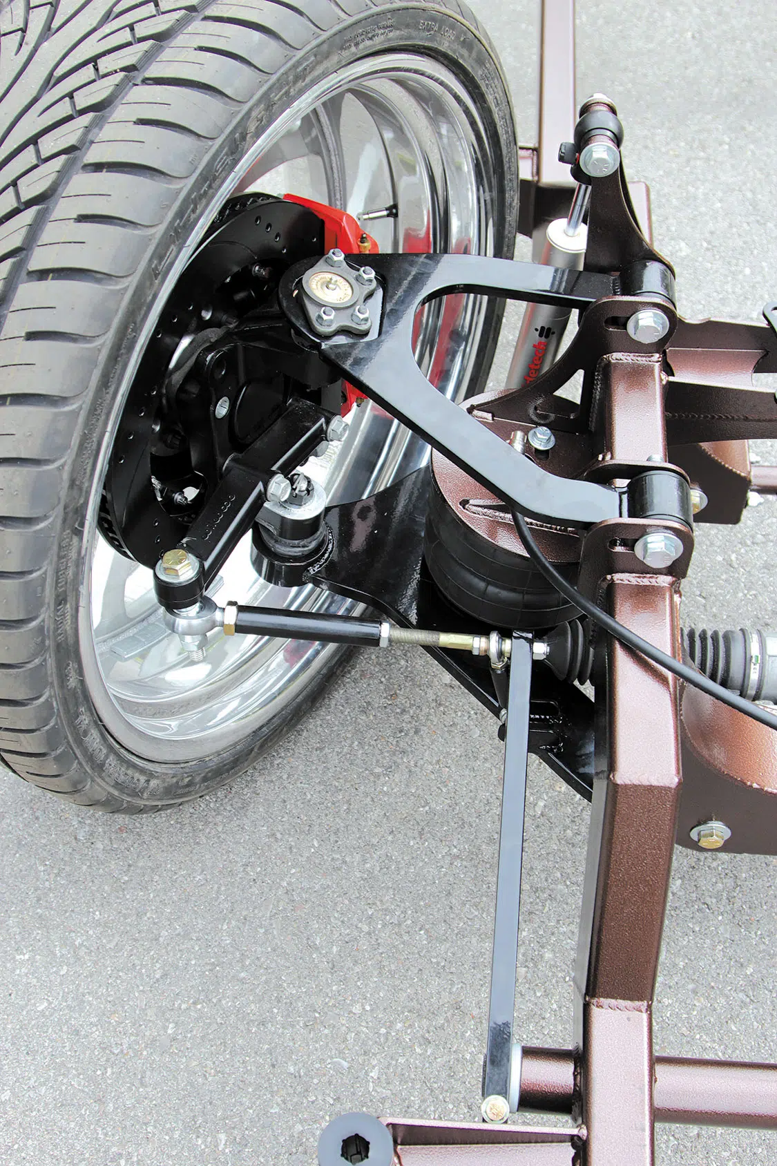 Phat Phabz has a wide assortment of impressive and complete chassis systems (including ’88-’98 pickup) but this one here is designed specifically for the two-door Tahoe/Yukon platform. The control arm setup allows for up to 14.5 inches of lift—more than enough room to create comfortable space for large-diameter wheels. Be ready to experience a lock-to-lock turning radius without worrying about rubbing on the frame rails. A lowered rack-and-pinion mounting location in conjunction with lowered motor mounts keep the steering shaft from binding, as well as reducing sheetmetal cab floor modifications to a minimum. At the rear, a parallel 4-link system featuring sleeve air bags creates a stable and smooth ride quality to boot.