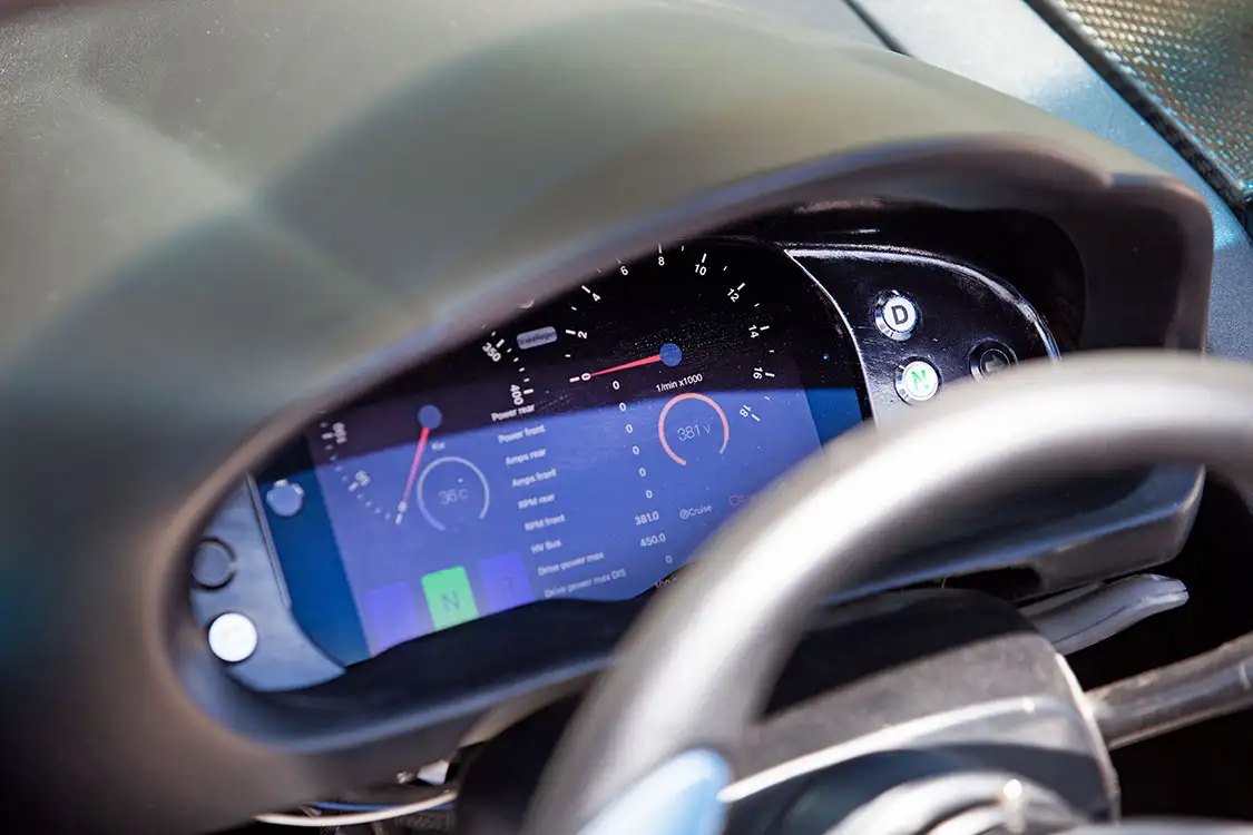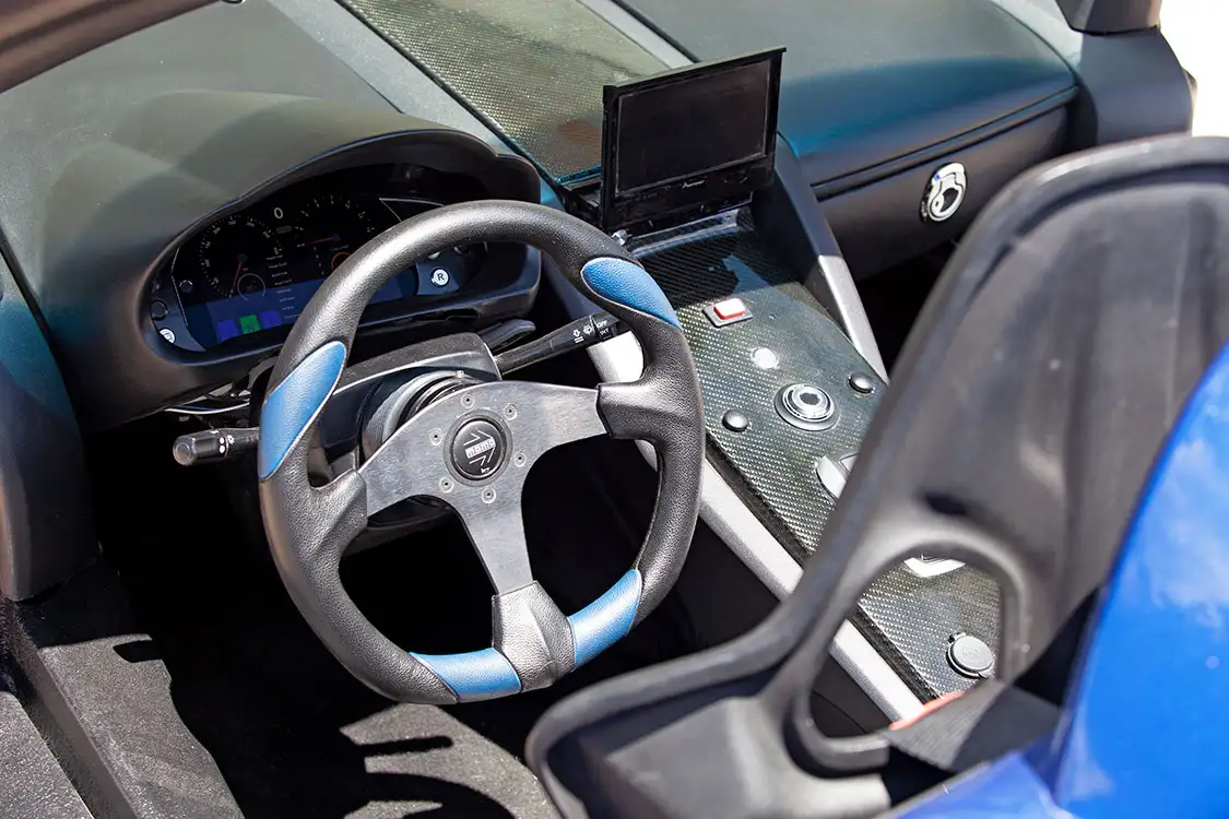 The K1’s original suspension components were reimagined, now featuring QA1 custom coilovers and Model S control arms, marrying Tesla’s engineering with racing-inspired dynamism. The braking system, vital to harnessing Wattson’s velocity, boasts 4 piston Brembo brakes on both the front and rear wheels.