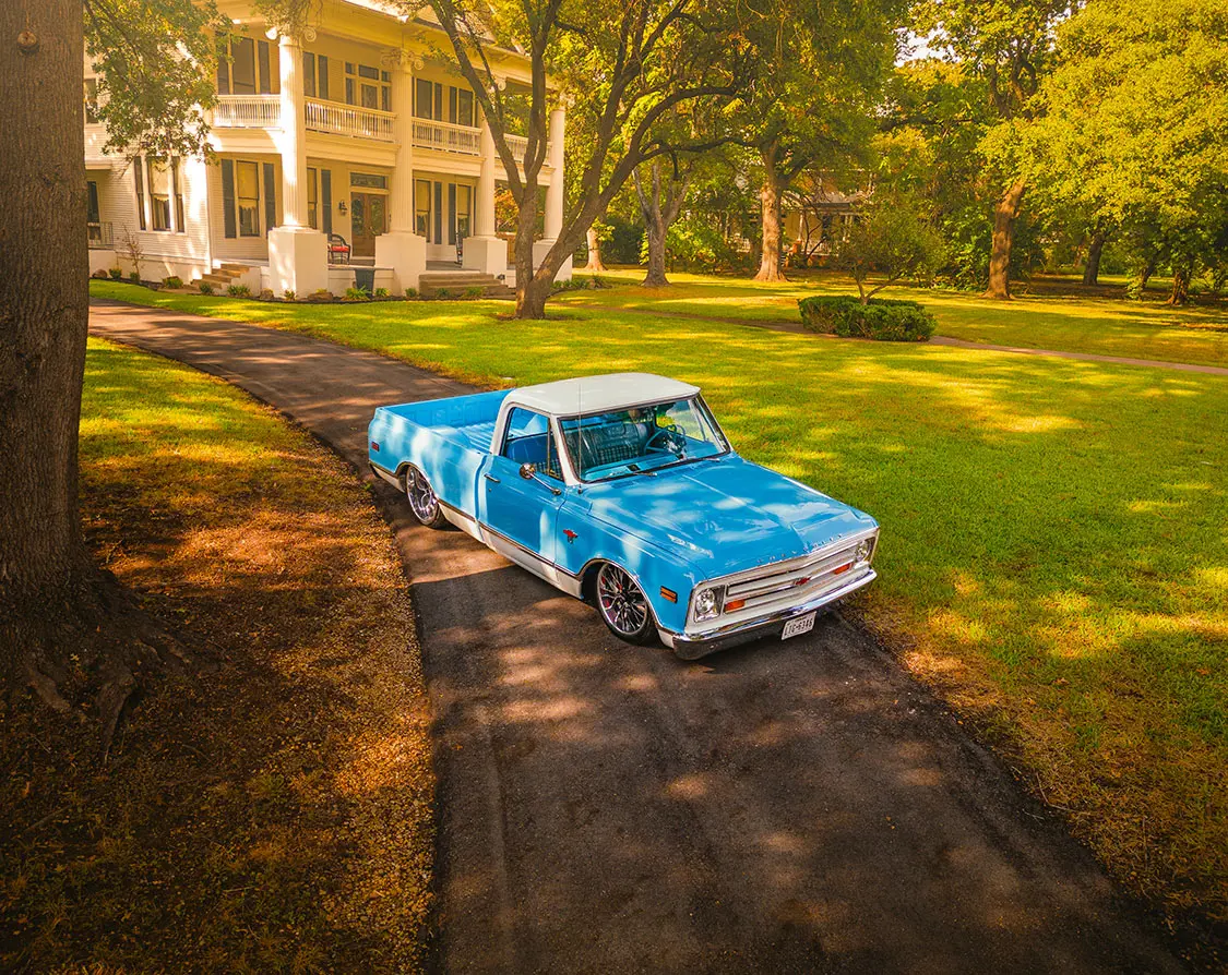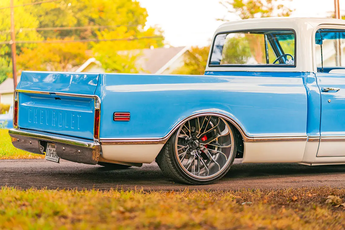 First, the bed had to be raised and customized as to better provide clearance for the altered frame back half below. Wider rear tubs were also fabricated, and all necessary body adjustments were expertly executed in record time. The next order of business was to apply the two-tone blue and white PPG hues, and once the entire truck was wet sanded and buffed to a blinding brilliance, the C10’s surface was sealed with a five-year ceramic coating from Shine Supply. The outcome left Cesar’s Chevy looking clean and classic, which was the exact appearance he was after.