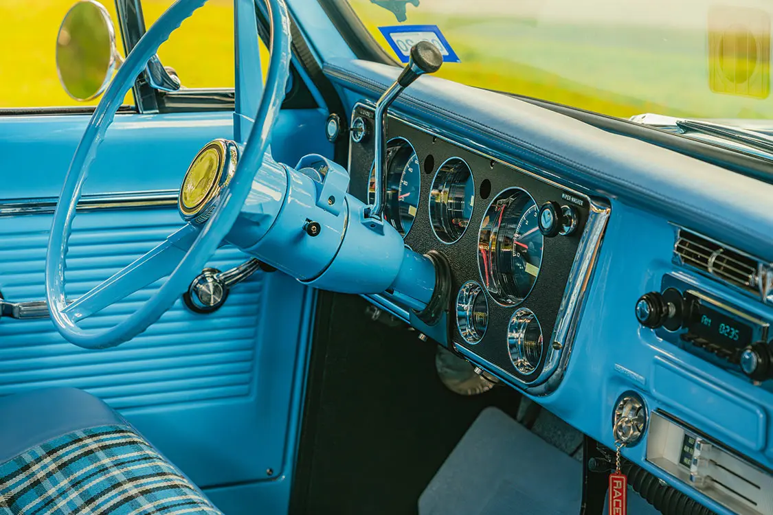 The same clean, period-correct vibe was also the goal set for the interior space. The same color paint used on the exterior surfaces was used on throughout the cab, and what wasn’t sprayed blue was blessed with the magic touch of Rafa’s Custom Upholstery in McAllen, Texas. The one-off bench seat was covered with blue ultra-leather and contrasting plaid inserts, and the team at Rafa’s even whipped up a new dashpad, armrests, and headliner, and they laid down fresh carpeting for full in-cab refreshment. While the interior didn’t take too wild of a turn in the rehab process, there’s a lot to be said about keeping customizations simple and refined.