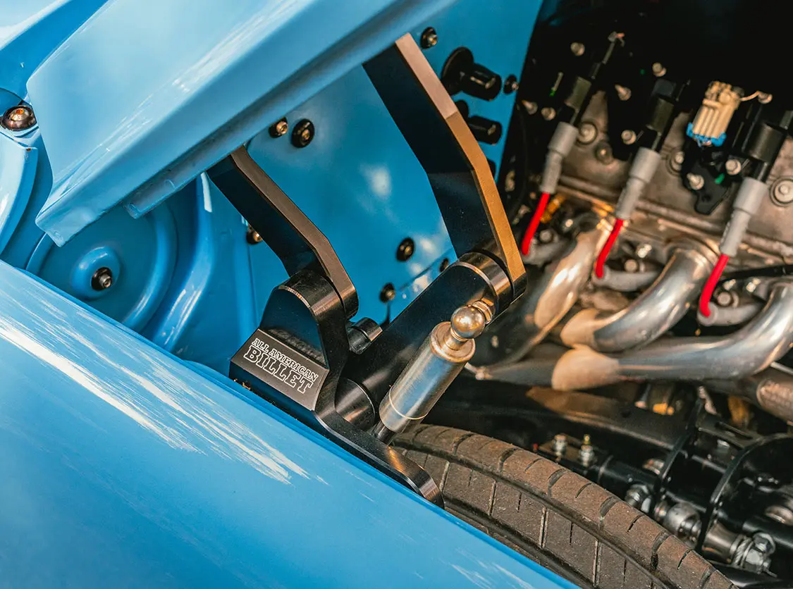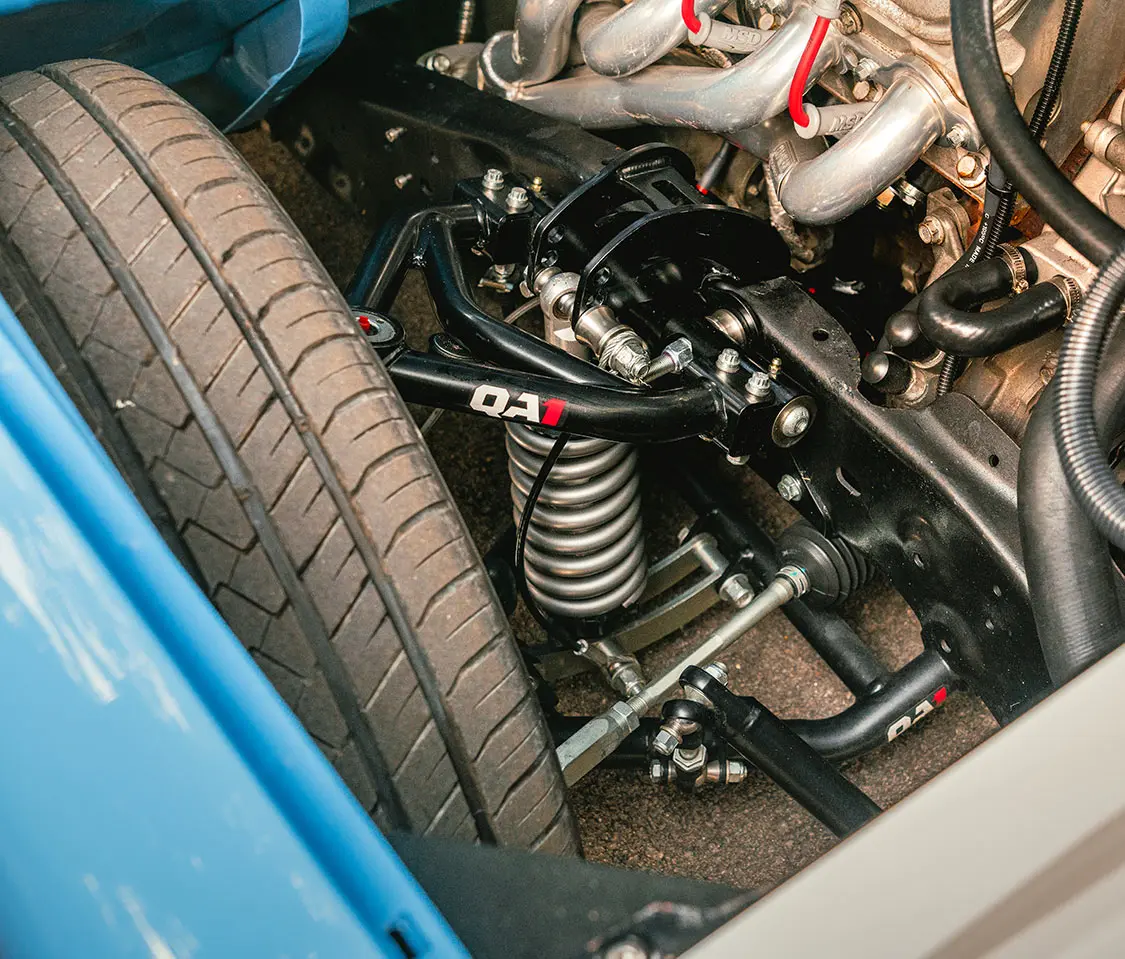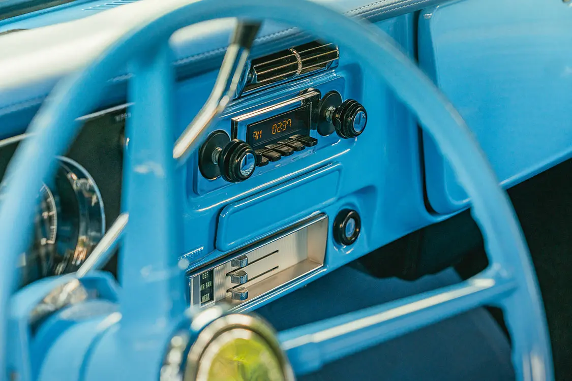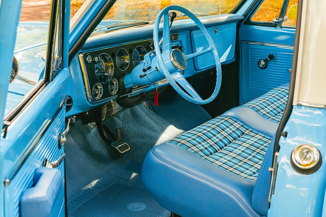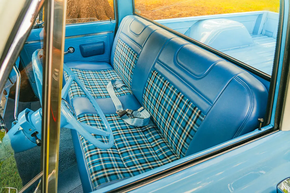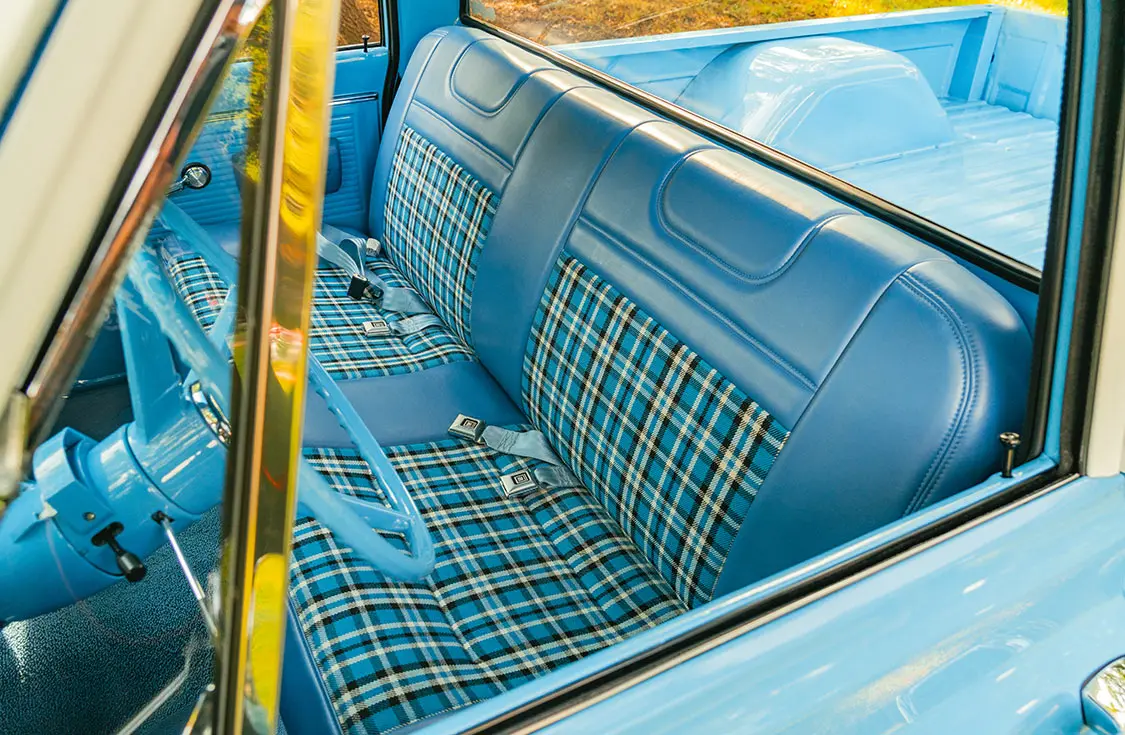 The one-off bench seat was covered with blue ultra-leather and contrasting plaid inserts, and the team at Rafa’s even whipped up a new dashpad, armrests, and headliner, and laid down fresh carpeting for full in-cab refreshment.