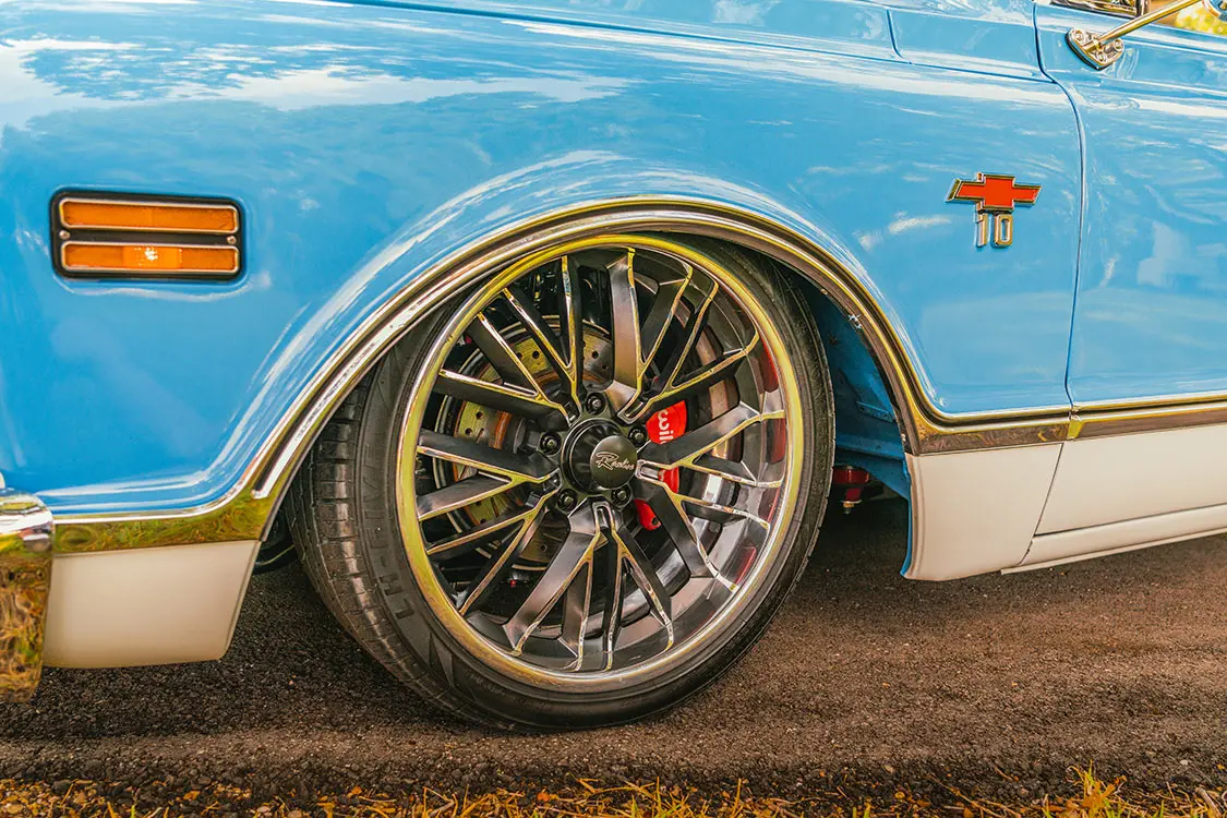 The much more aggressive suspension system was dialed in with and ideal ride height that would comfortably fit an upgraded set of rolling gear. Cesar selected a set of 20×8.5 Raceline El Dorado forged aluminum wheels for the front hubs, and a larger, wider set of 22x12s for the rear. The wheels have a sporty yet classic aesthetic, and they frame the Wilwood rotors and calipers lurking behind them nicely. Lionhart performance tires have also been included to give the truck the traction required to successfully whip around a road course whenever Cesar feels the urge.