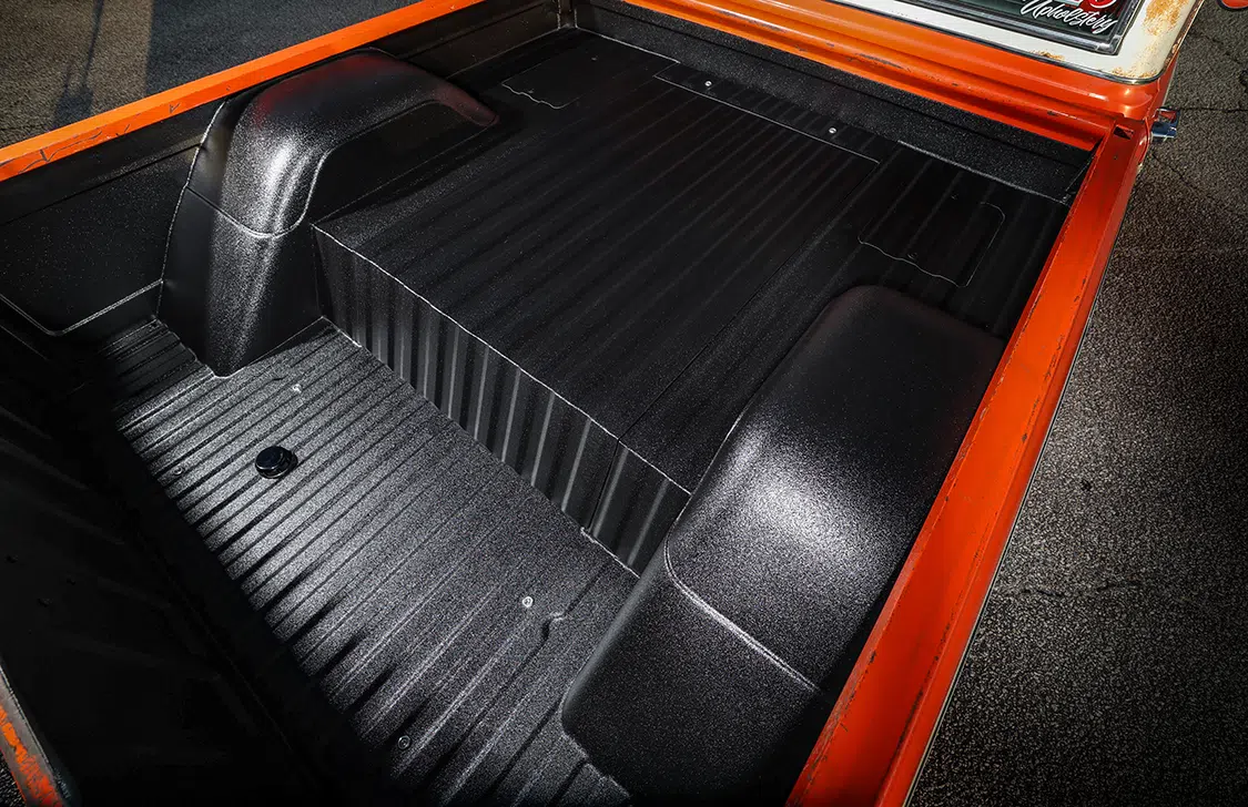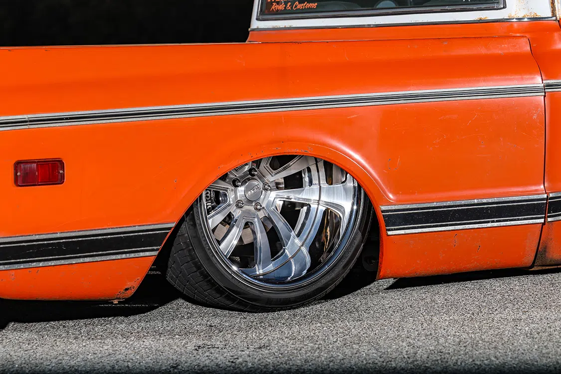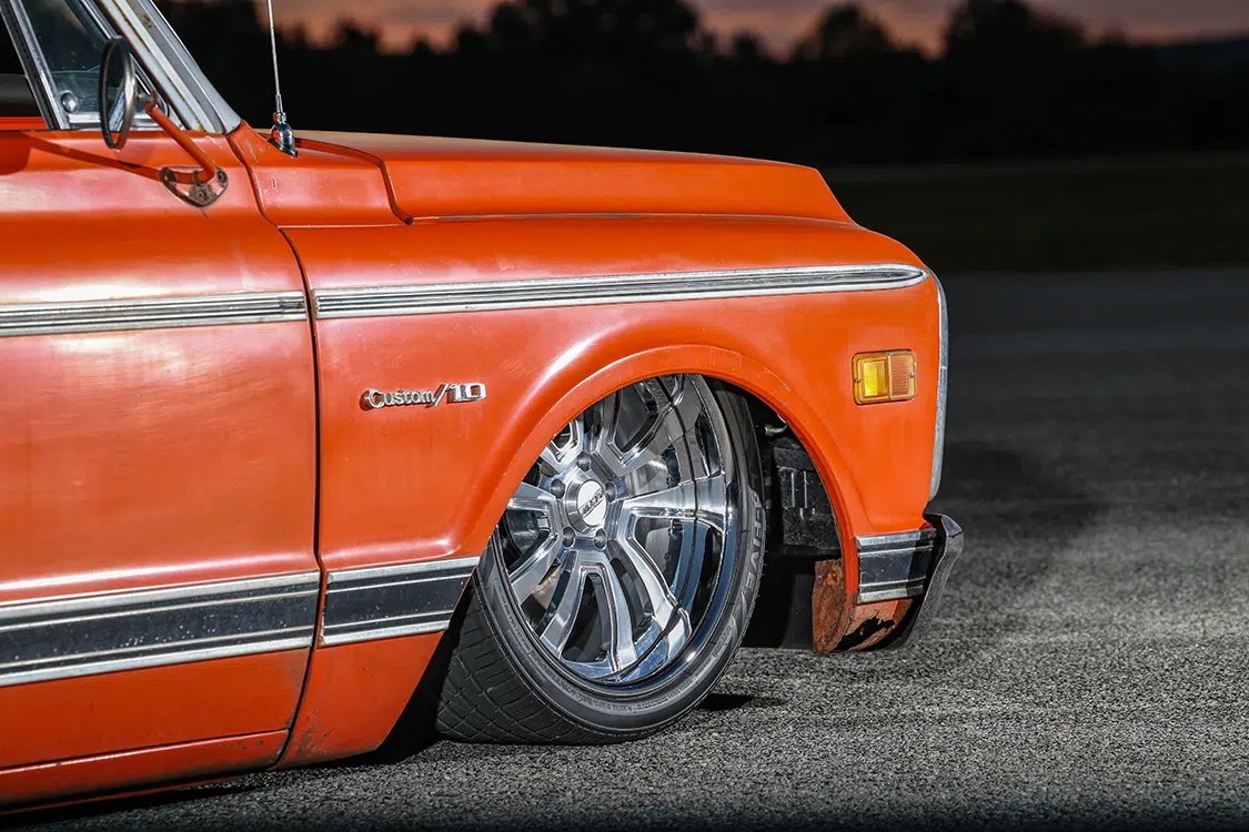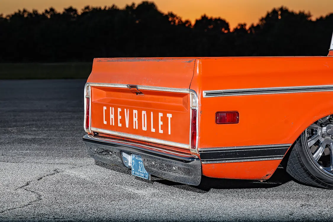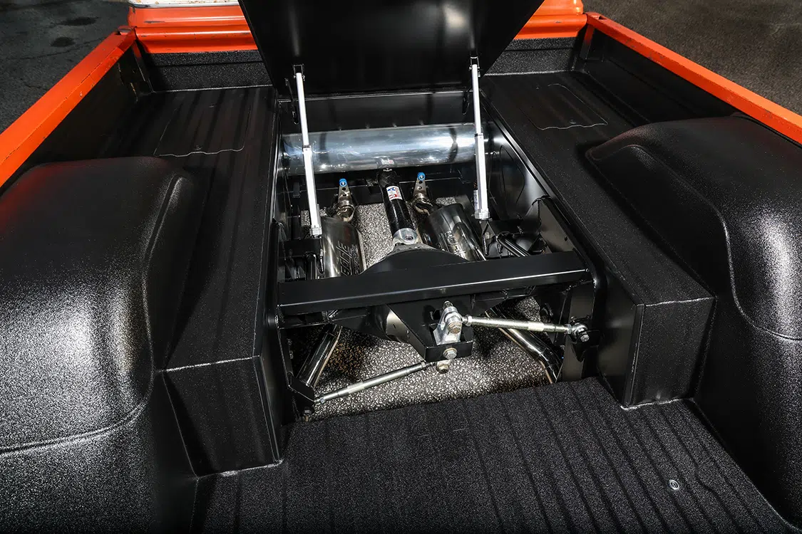 With the complete rolling chassis and drivetrain ready for the 1970 C10 body to go on, there had to be some modifying to make it all work correctly together. The factory orange and white paint was left alone to give it an old school look with the perfect patina. The cab bolted right onto the chassis while the front end had to receive VanNatta Fab front inner fenders to clear the new wheels and tires, as well as some custom sheetmetal painted black with billet fasteners. They also painted the engine covers in-house to match the truck and give the modern engine a modern look. For the bed, Andy and Jamie used AMD bed floor panels and widened tubs to make the custom bed floor fit their needs. The center section raises up to access the rear and to show the chassis off at shows. The rear of the bed floor is still at factory height to allow luggage and show gear plenty of room while driving this truck to shows. A bed liner was also sprayed in to make it more durable as well.