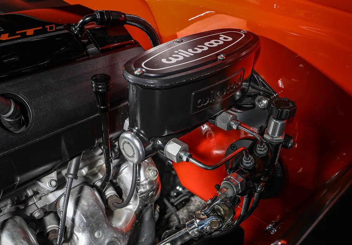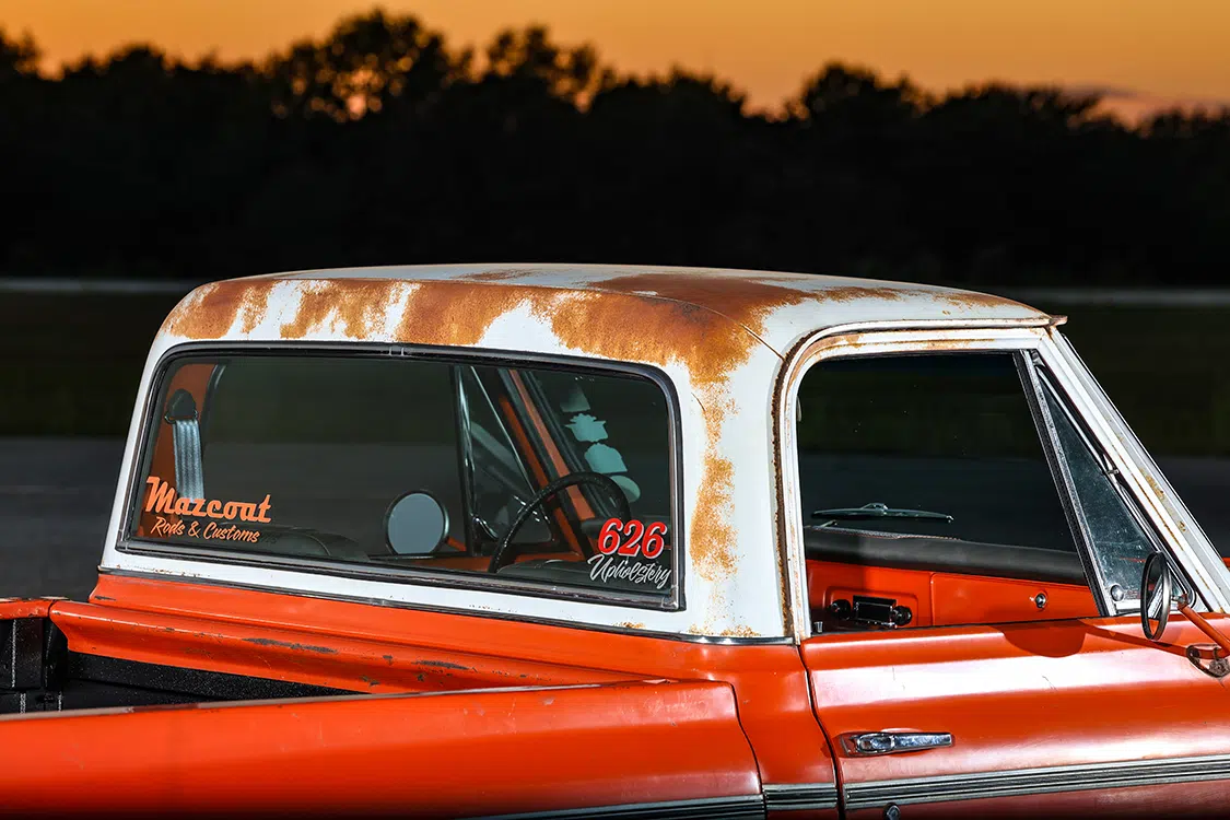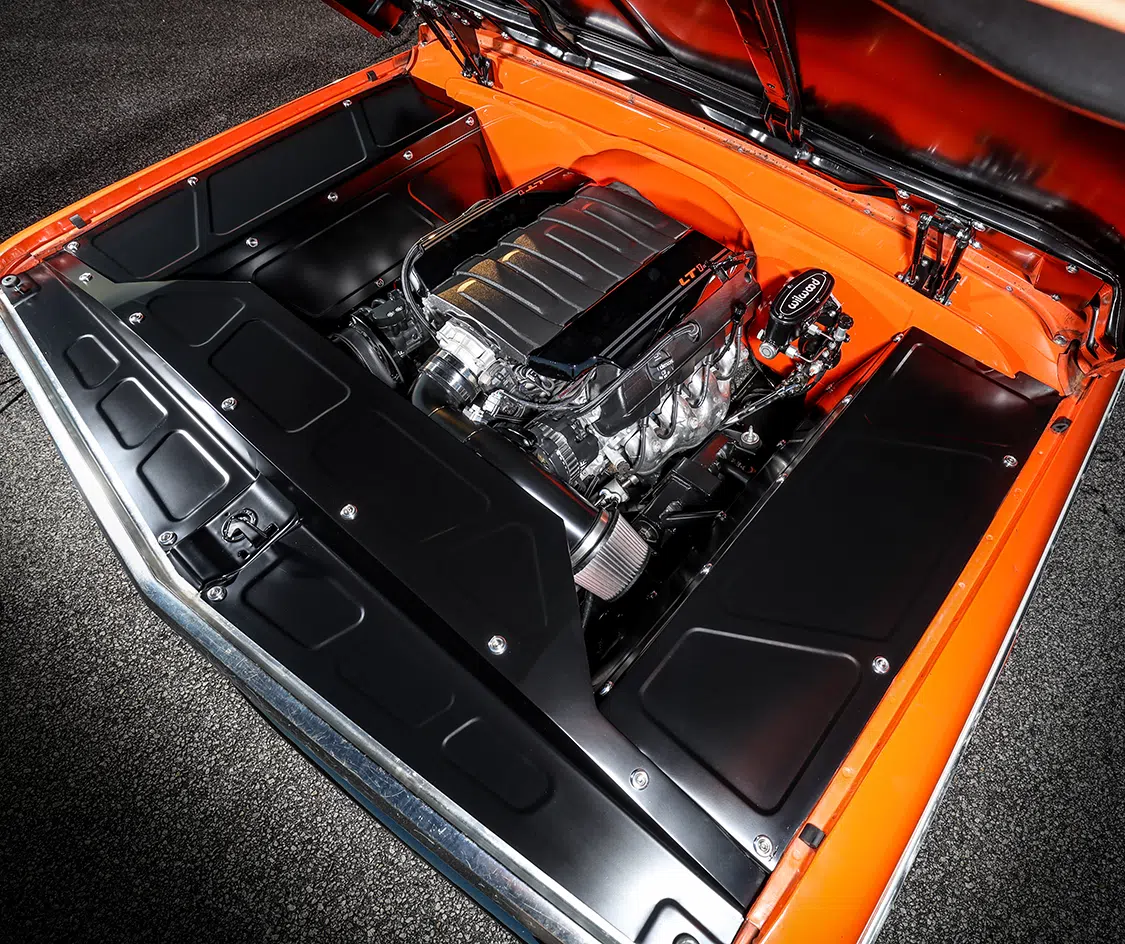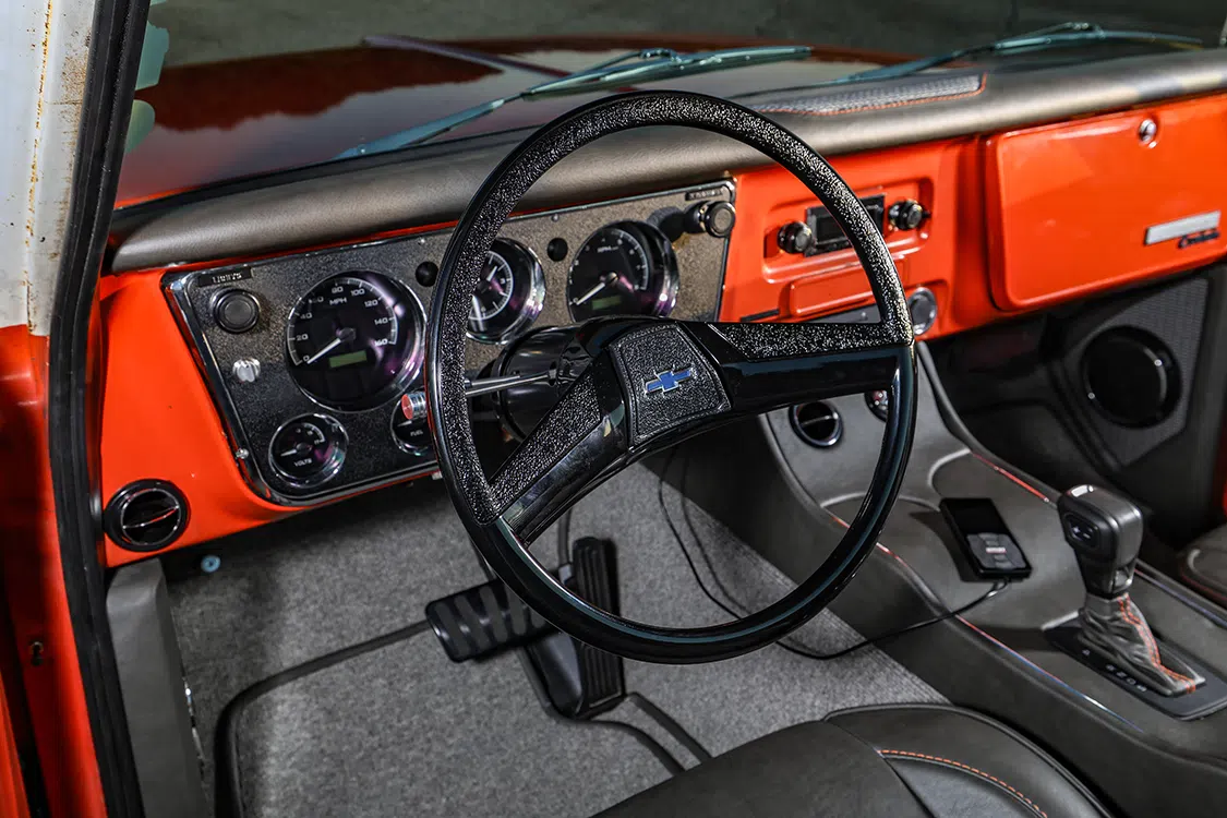 With the complete rolling chassis and drivetrain ready for the 1970 C10 body to go on, there had to be some modifying to make it all work correctly together. The factory orange and white paint was left alone to give it an old school look with the perfect patina. The cab bolted right onto the chassis while the front end had to receive VanNatta Fab front inner fenders to clear the new wheels and tires, as well as some custom sheetmetal painted black with billet fasteners. They also painted the engine covers in-house to match the truck and give the modern engine a modern look. For the bed, Andy and Jamie used AMD bed floor panels and widened tubs to make the custom bed floor fit their needs. The center section raises up to access the rear and to show the chassis off at shows. The rear of the bed floor is still at factory height to allow luggage and show gear plenty of room while driving this truck to shows. A bed liner was also sprayed in to make it more durable as well.