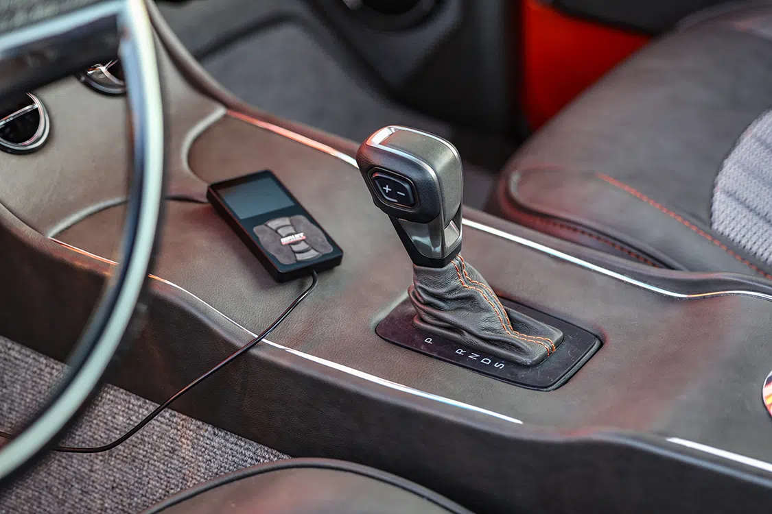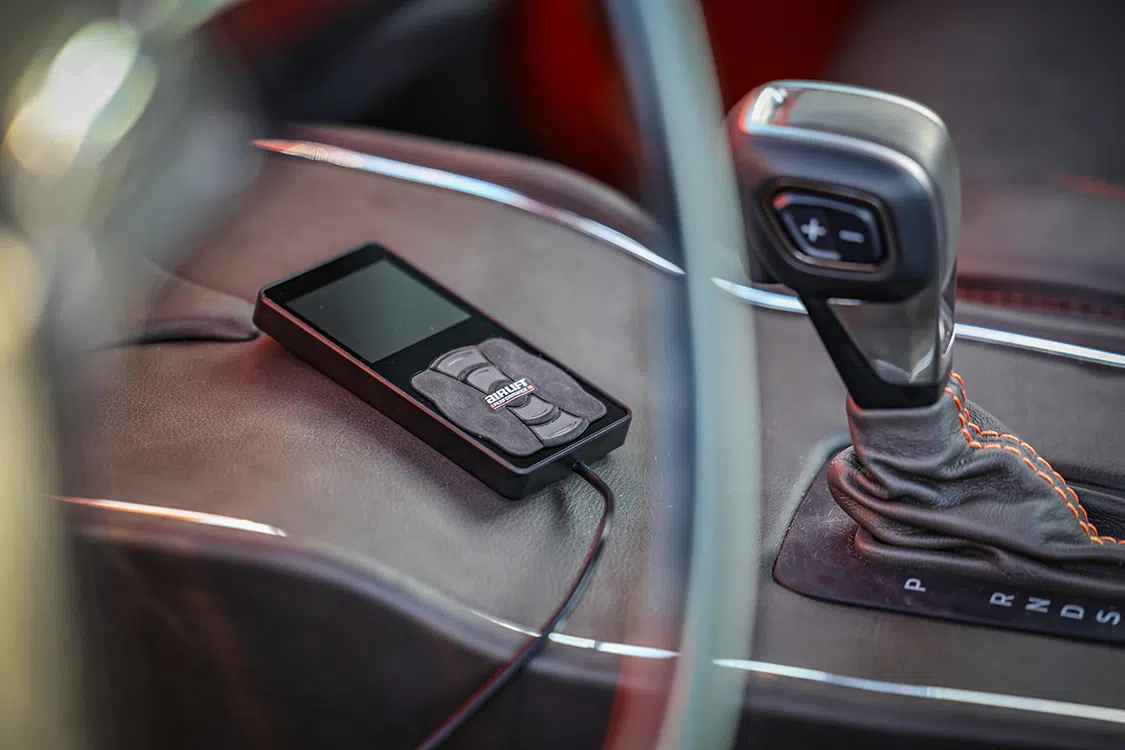 Painting the new chassis black was the first thing in the mix before adding the Air Lift 3P system with two Viair 485 compressors. Firestone air bags fit perfectly in each corner and the new rack-and-pinion steering controlled the corners. To make it a complete rolling chassis, 14-inch Wilwood rotors were added on all corners and MTW billet Chalone 5 wheels in a 20- and 22-inch setup wrapped in Lionhart LH-Five tires were bolted on. Now that the roller was the way they wanted it, it was time to fit an engine between the front frame rails that would get the truck moving quickly when needed. For this, Andy and Jamie found a donor 2018 Camaro and used the 6.2L V-8, LT1 engine. Because the donor only had 2,500 miles on it, they opted not to tear into it and rebuild it as it still had more than enough life in it. Making this new heart of the truck work correctly, they used a Swap Time USA harness and a CVF Racing front accessory drive. It was mated to an 8L90 transmission with a tap shift shifter. From there, the power is fed through a custom carbon fiber driveshaft from USA Driveline, Inc. into the Ford 9-inch rearend with 3.73 gears and a locker.