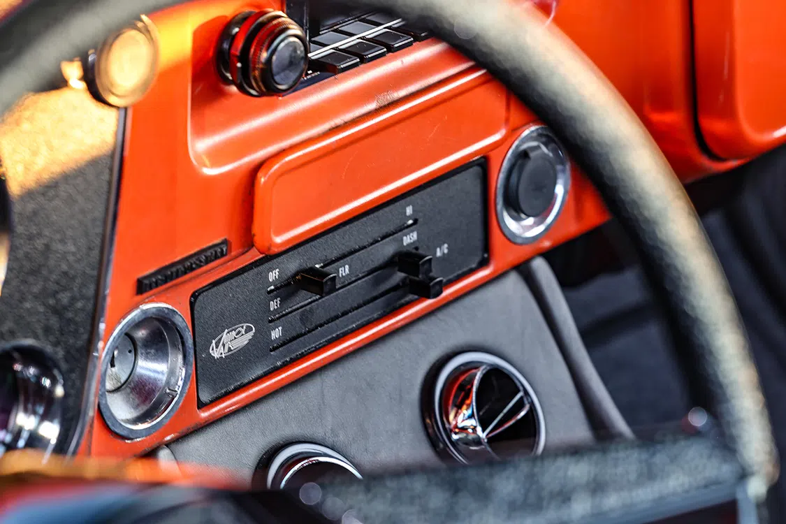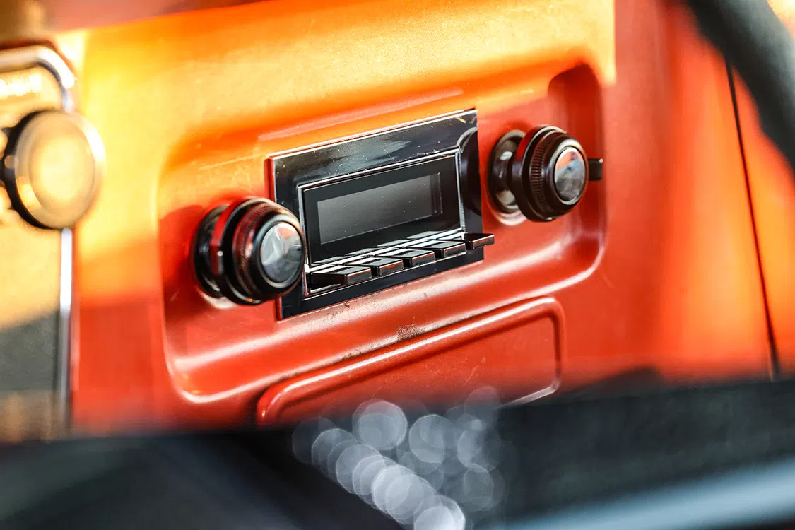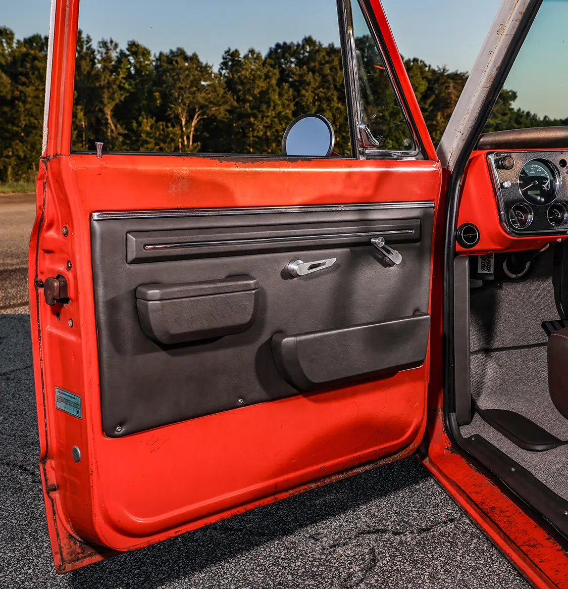 Inside the truck, the paint was left original to match the exterior, but they had 626 Upholstery in Baldwin, Georgia, work their magic on the other panels. A set of Snowden Seats bucket frames and foam was wrapped in graphite leather with cloth inserts. The custom center console as well as the door panels and dash pad were also wrapped to match. New Dakota Digital VHX gauges were added as well as a CJ Classic Trucks 15-inch replica steering wheel to make the interior look brand new. A Vintage Air system and a RetroSound 4HD radio makes sure all future trips are comfortable.