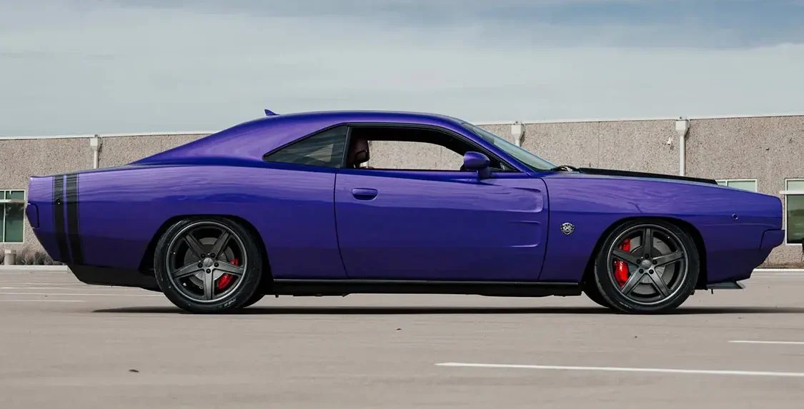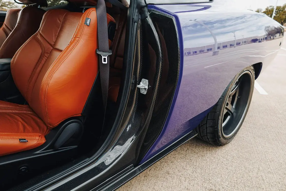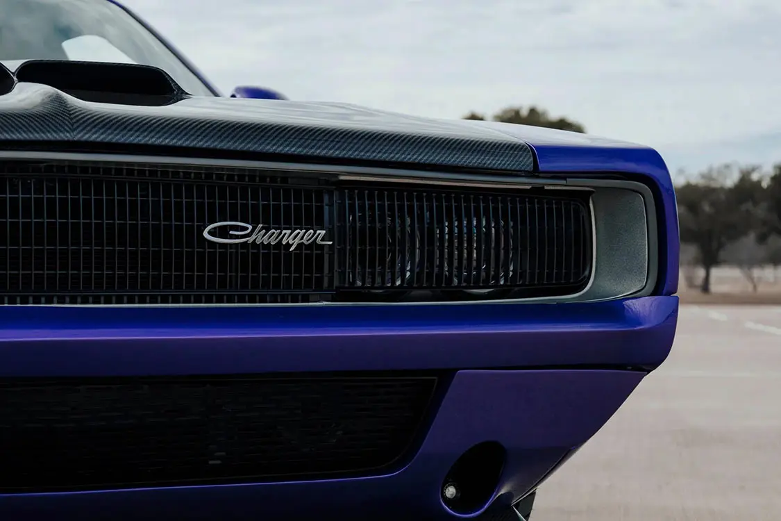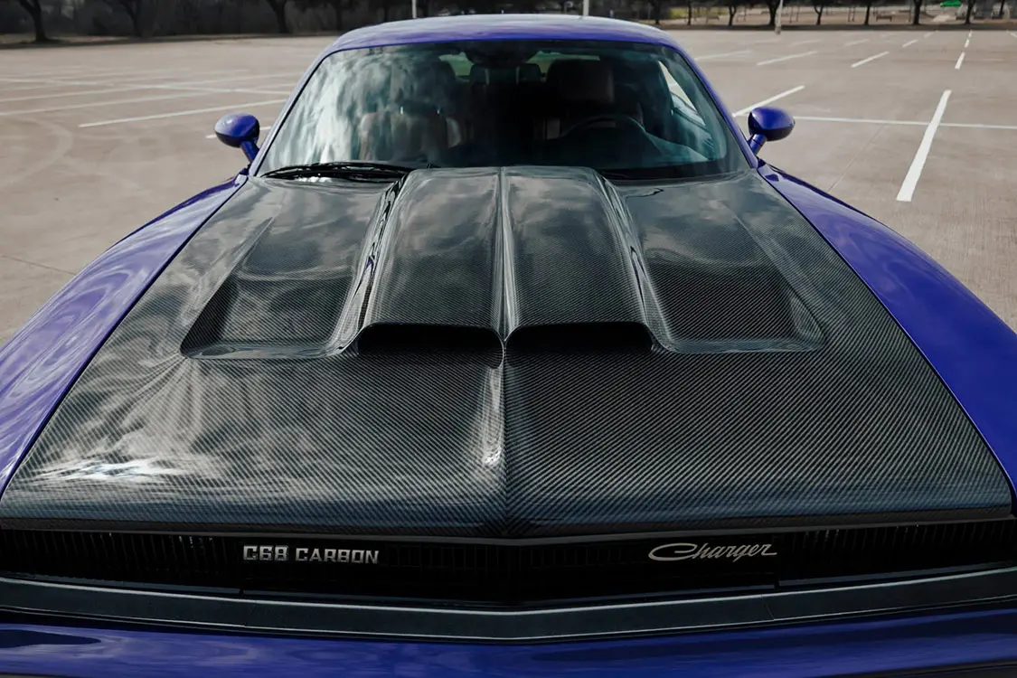 The Challenger SRT Hellcat chassis was fitted with a 1968 Dodge Charger–style molded-carbon-fiber exoskeleton body and reportedly painted in a shade of Plum Crazy Pearl with exposed-carbon-fiber bumblebee tail stripes. Additional modifications include a slatted front grille, machined headlight doors, argent grille surrounds, scalloped doors, a satin-black tail panel, and center-exit dual-exhaust finishers as well as an exposed-carbon-fiber dual-scoop hood, front valance, rear diffuser, and rocker panels. Said to measure 4” wider than a 1968 Dodge Charger, the car also has HID Air-Catcher headlamps, C68 CARBON and eXoMod Concepts badging, a gunmetal flip-up fuel cap, fitted body-color bumpers, smoked LED sequential taillamps, and 1968 Charger-style round side-marker lights. The car was unveiled at the 2022 SEMA show in Las Vegas, Nevada.
