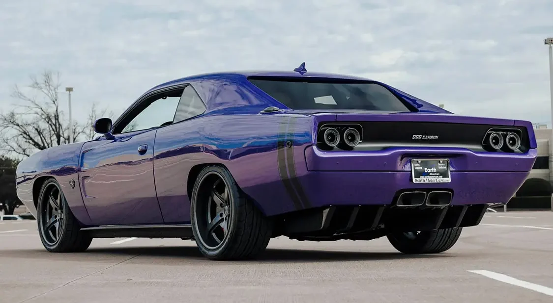This 2021 Dodge Challenger SRT Hellcat was modified for the 2022 SEMA show by eXoMod Concepts of Greenville, Pennsylvania, and fitted with a bespoke 1968 Dodge Charger–style carbon-fiber exoskeleton body, which features a slatted front grille, center-exit dual-exhaust finishers, HID Air-Catcher headlamps, and LED taillamps as well as exposed carbon fiber on the functional dual-scoop hood, front valance, rear diffuser, rocker panels, and door jambs. Power is provided by a supercharged 6.2-liter Hemi V8 mated to an eight-speed automatic transmission and a limited-slip differential, and the car is finished in Plum Crazy Pearl. Additional features include a competition suspension, electric power steering, 20” Forgeline Rodster wheels, Brembo brakes, C68 Carbon badging, a flip-up fuel cap, Katzkin Italian Amaretto leather seat covers and door panels, a suede headliner, an 18-speaker Harman Kardon sound system, and UConnect touchscreen infotainment with navigation. The car was acquired by the current owner in spring 2022 and the build was completed in October 2022. This modified Hellcat is now offered on dealer consignment in Texas with a clean Carfax report and a clean Montana title in the name of the owner’s business.