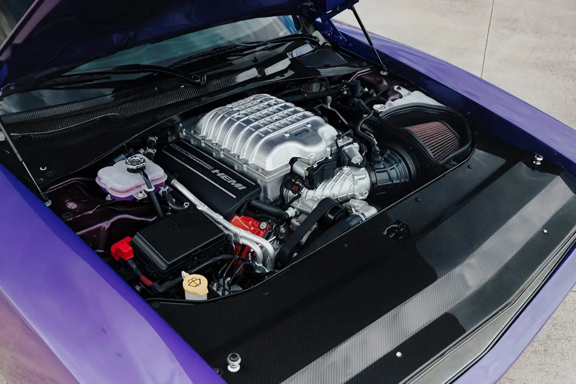The supercharged and intercooled 6.2-liter Hemi V8 was factory rated at 717 horsepower and 656 lb-ft of torque. A fluid service was performed in February 2023. An exposed-carbon-fiber close-out panel and cowl panel have been fitted in the engine compartment.