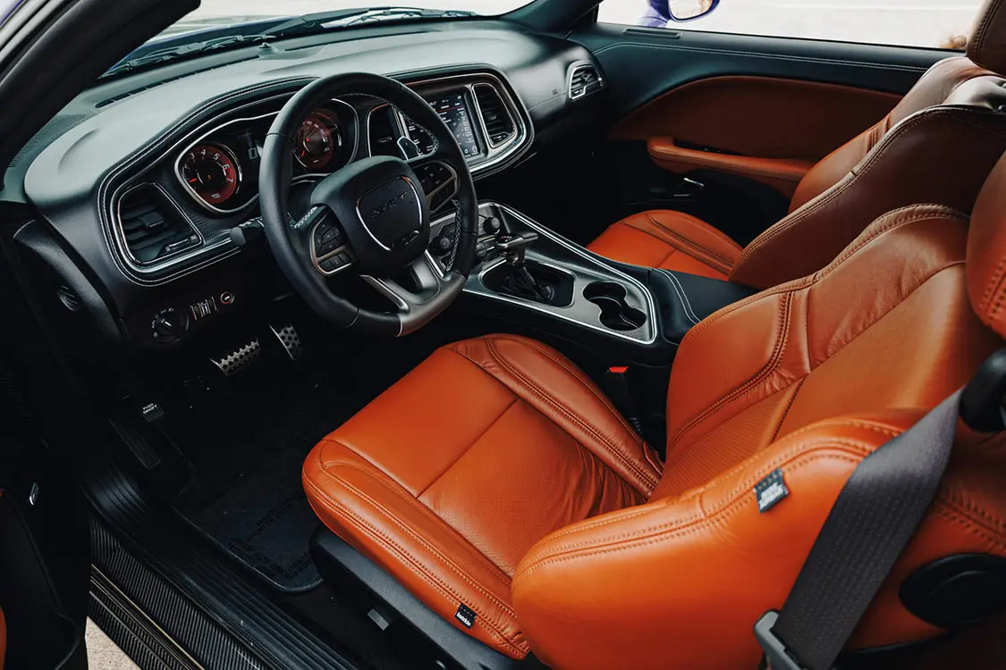 The cockpit offers heated and ventilated front bucket seats and a contoured rear bench reupholstered in Katzkin Italian Amaretto leather complemented by matching door-panel inserts. Additional equipment includes a suede headliner, exposed-carbon-fiber door jambs, remote start, SRT badging, dual-zone automatic climate control, an 18-speaker Harman Kardon sound system with a trunk-mounted subwoofer, and UConnect infotainment with navigation.