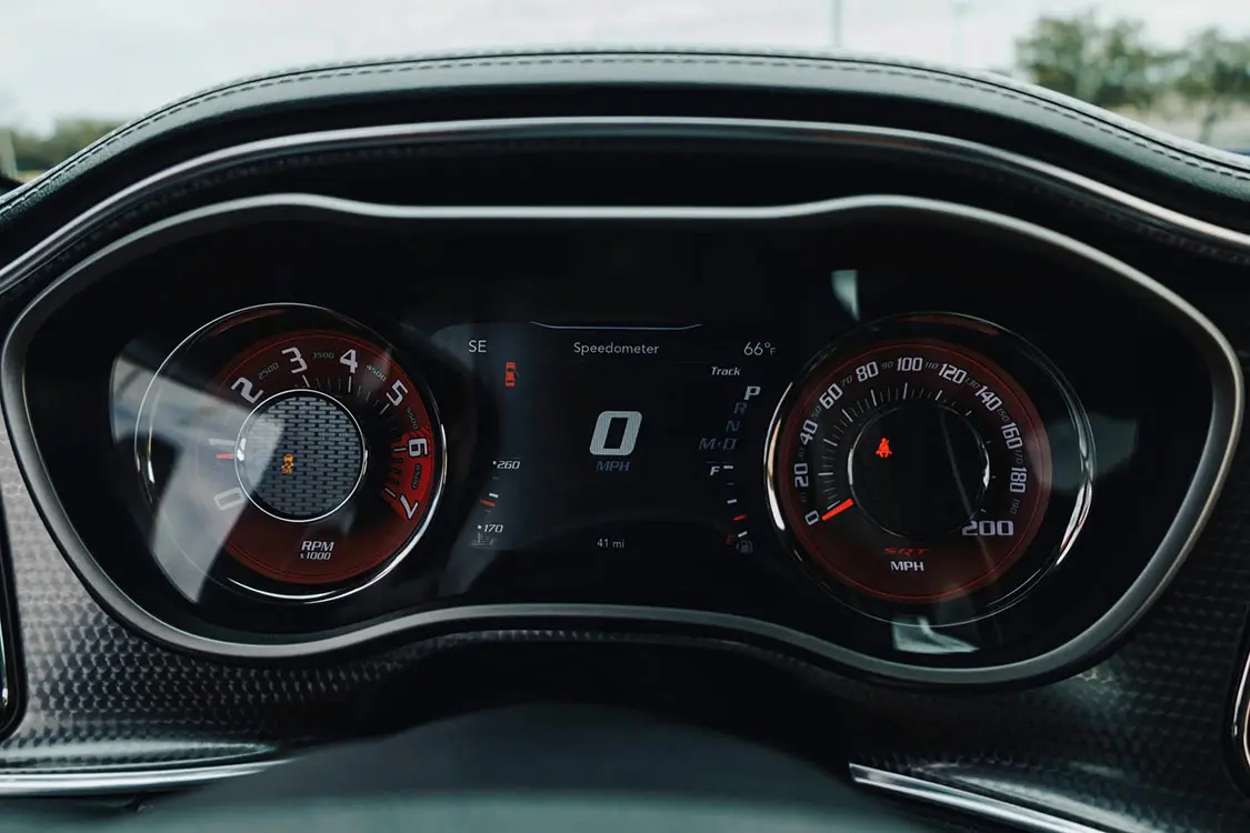 The multifunction SRT steering wheel is wrapped in black Laguna leather and features paddle shifters. Instrumentation includes a central configurable display flanked by a 200-mph speedometer and a tachometer with a 6,000-rpm redline. The digital odometer indicates 49 miles.