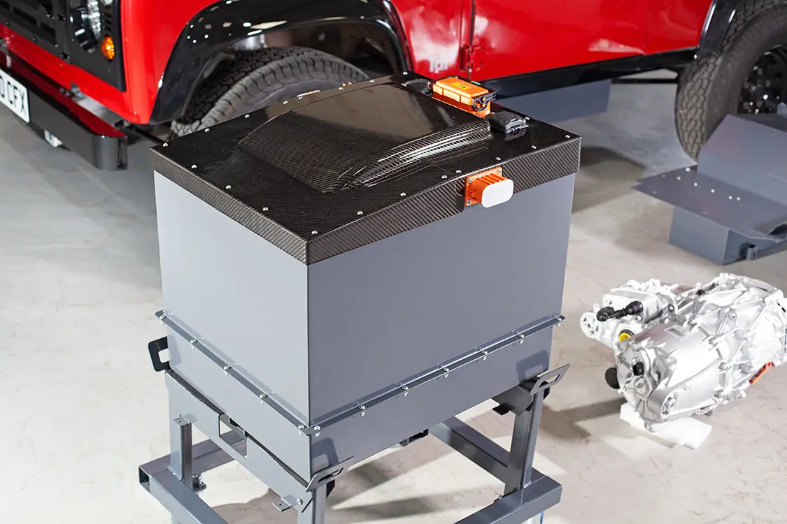 The UBP55E is a compact, high-density battery pack that fits under the bonnet of larger classic vehicles, including 4x4s, muscle cars, trucks, and bigger sport cars. Its carbon fiber lid is a clear nod to the Land Rover hood, as co-founder and engineer Alex Dawood demonstrates.
