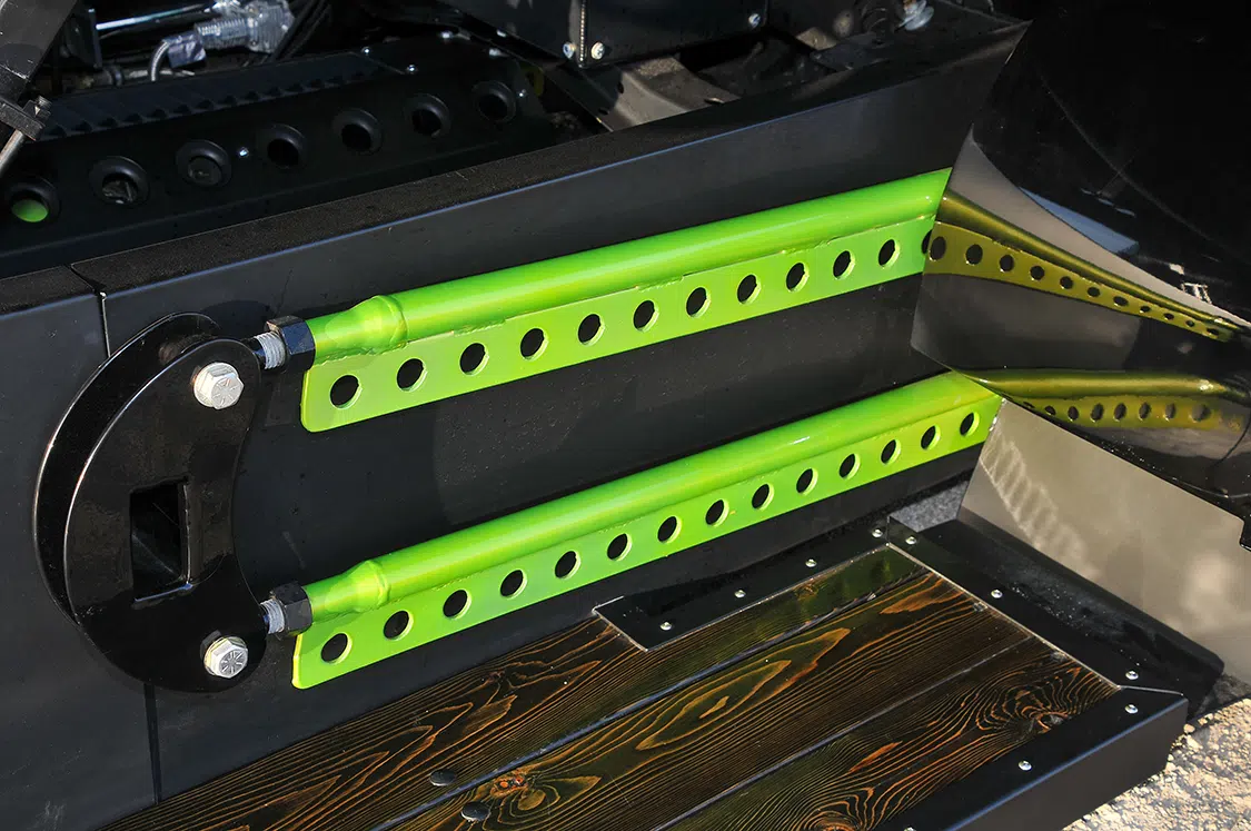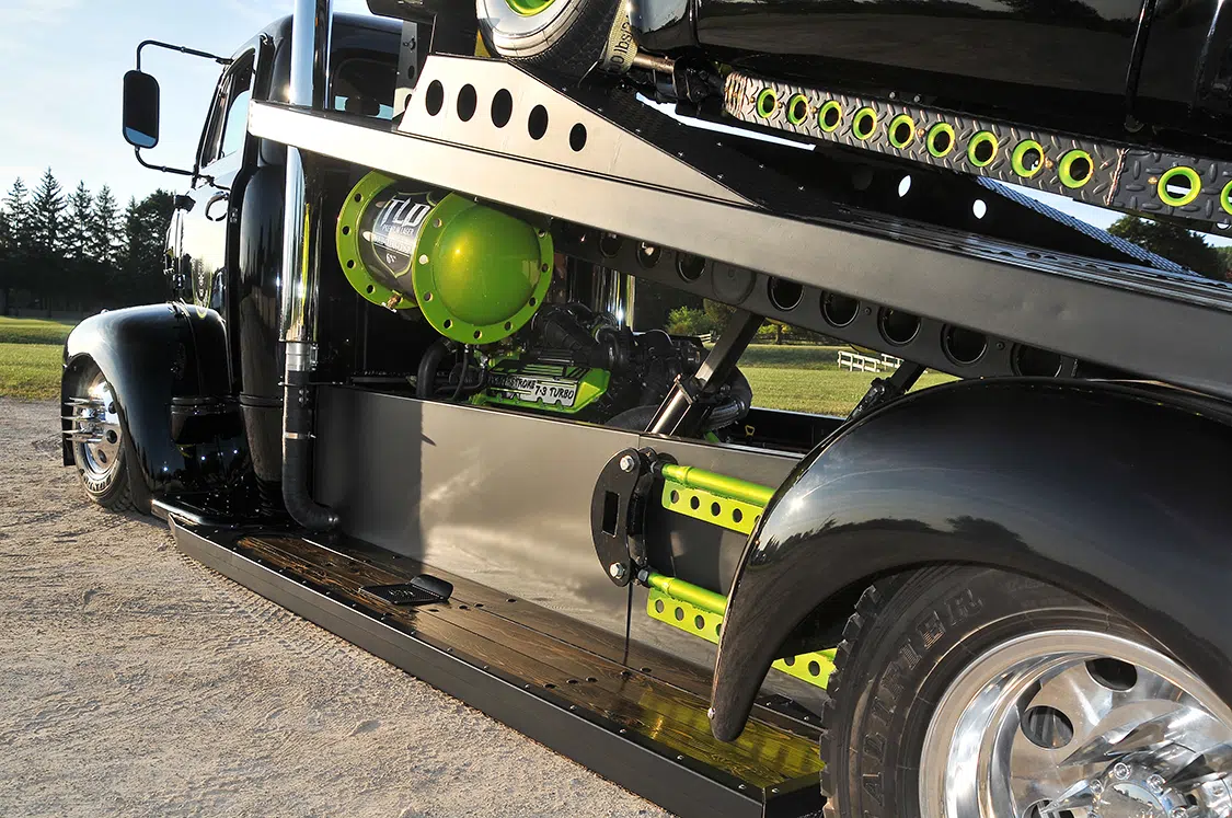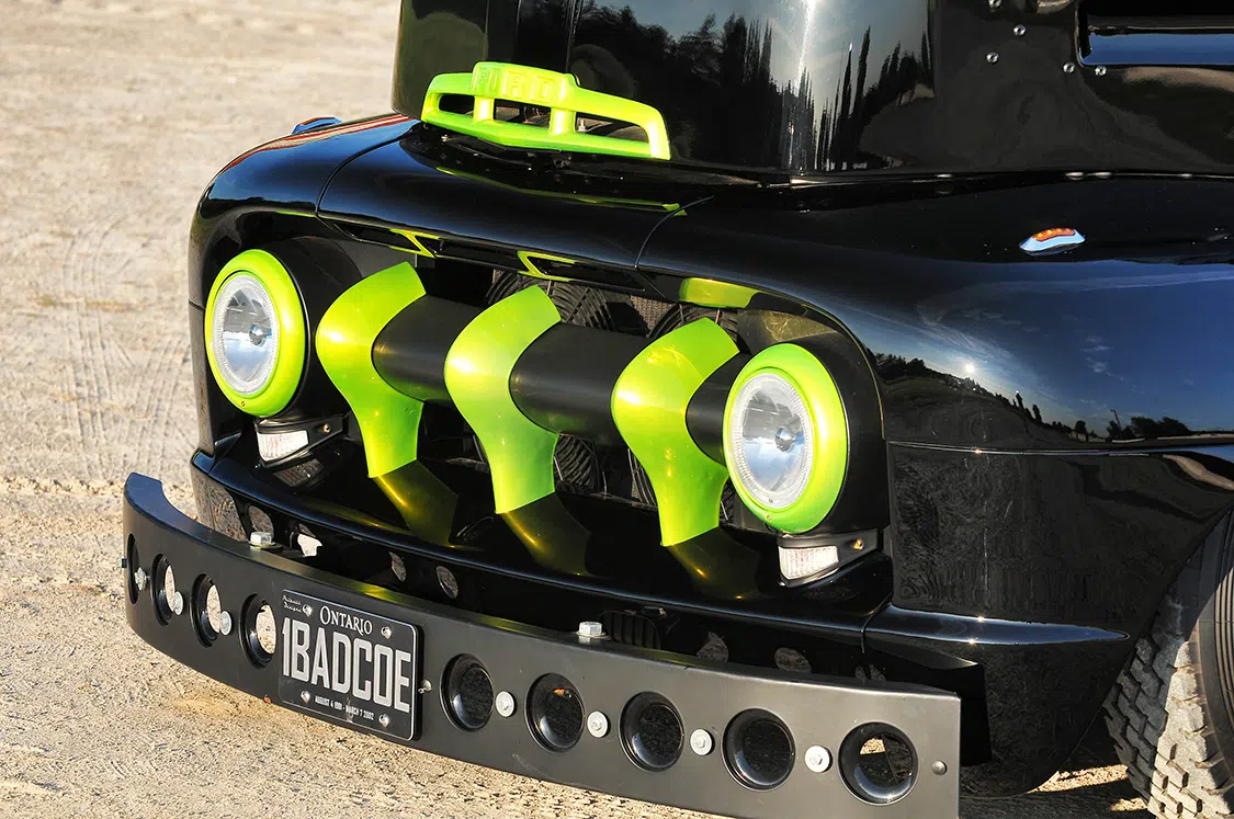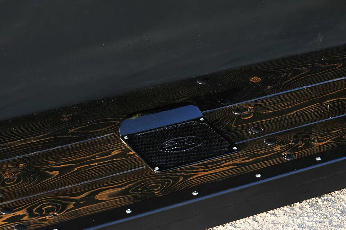 Troy went to the local woodmill and purchased cuts of Hemlock wood. The wood was dried and put in a wood planer to make the grain smooth. Torches were used to burn the wood and expose the black veins. Two coats of black ebony stain followed by three coats of Valspar clearcoat were added for weatherproofing. Once the deck and cab were put back together, remaining components were powdercoated black and their signature Shocker Green. Phil Cholette from Philbuilt Designs added his custom touch by adding a quarter-inch-thick true-sized billet aluminum plate that was engraved through the anodize to expose the raw aluminum 1BadCOE on the front.