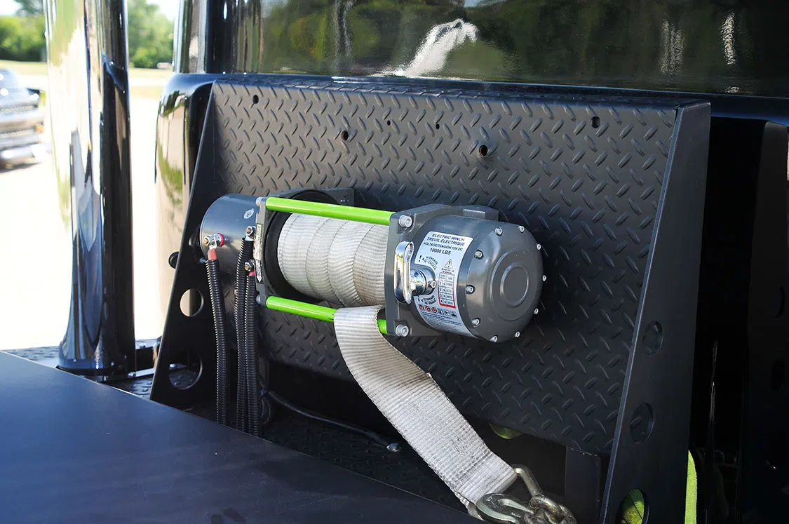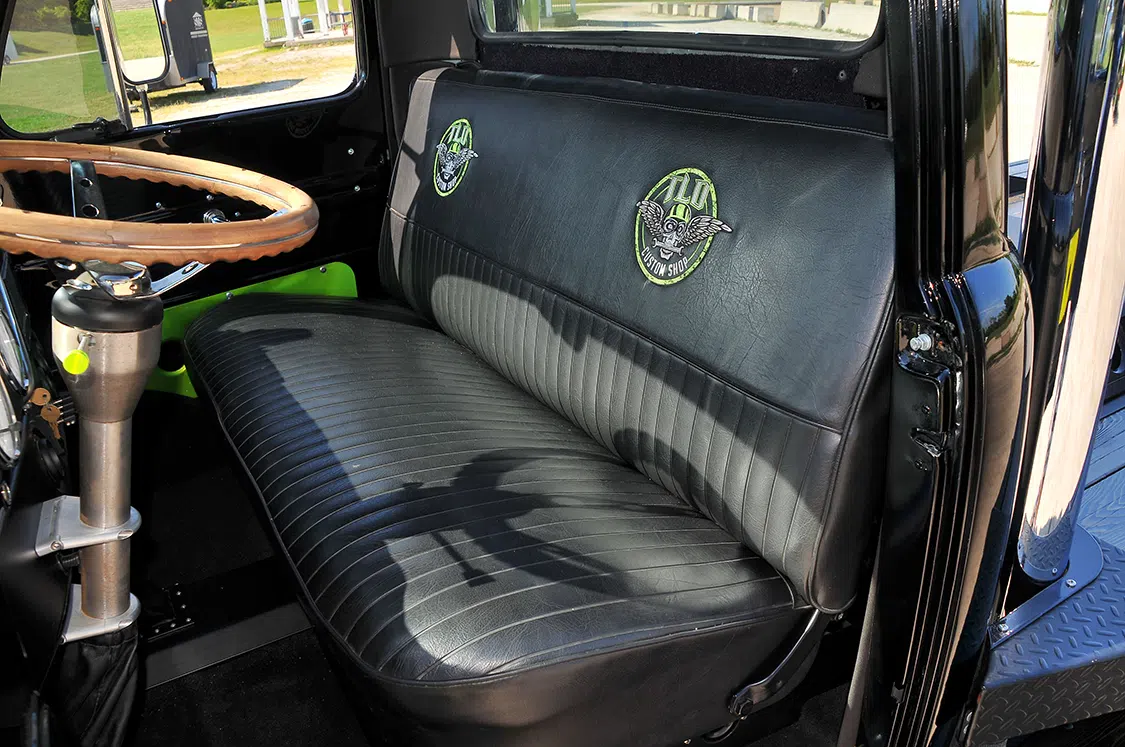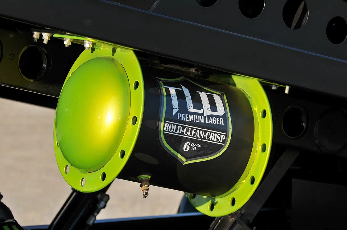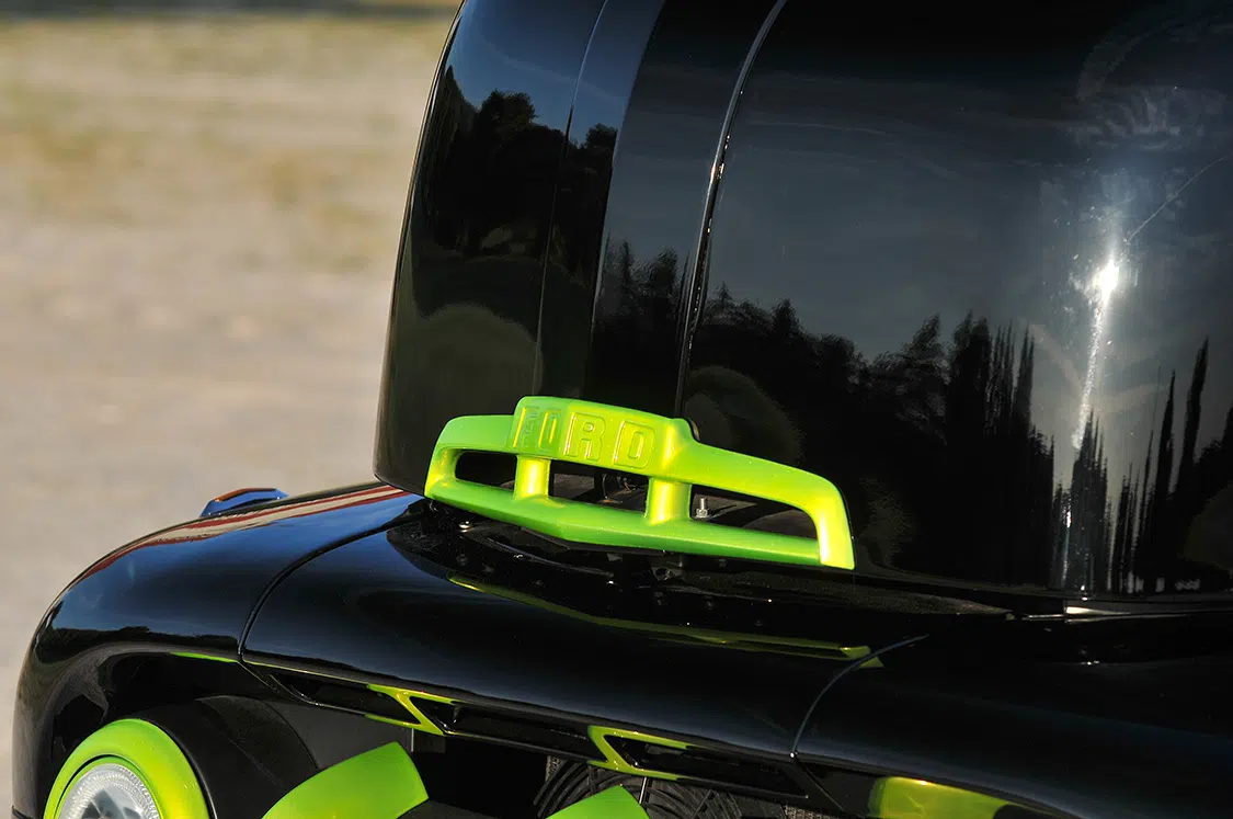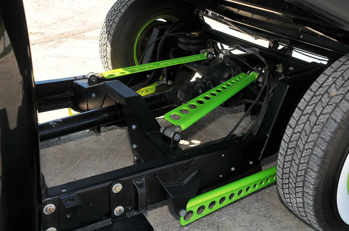 Troy went to the local woodmill and purchased cuts of Hemlock wood. The wood was dried and put in a wood planer to make the grain smooth. Torches were used to burn the wood and expose the black veins. Two coats of black ebony stain followed by three coats of Valspar clearcoat were added for weatherproofing. Once the deck and cab were put back together, remaining components were powdercoated black and their signature Shocker Green. Phil Cholette from Philbuilt Designs added his custom touch by adding a quarter-inch-thick true-sized billet aluminum plate that was engraved through the anodize to expose the raw aluminum 1BadCOE on the front.