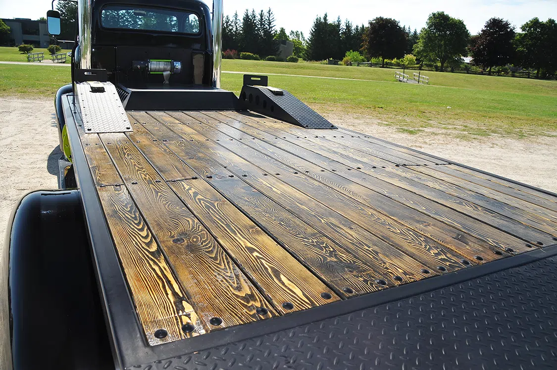 • Coated hydraulic tilt flatbed covered in finished Hickory