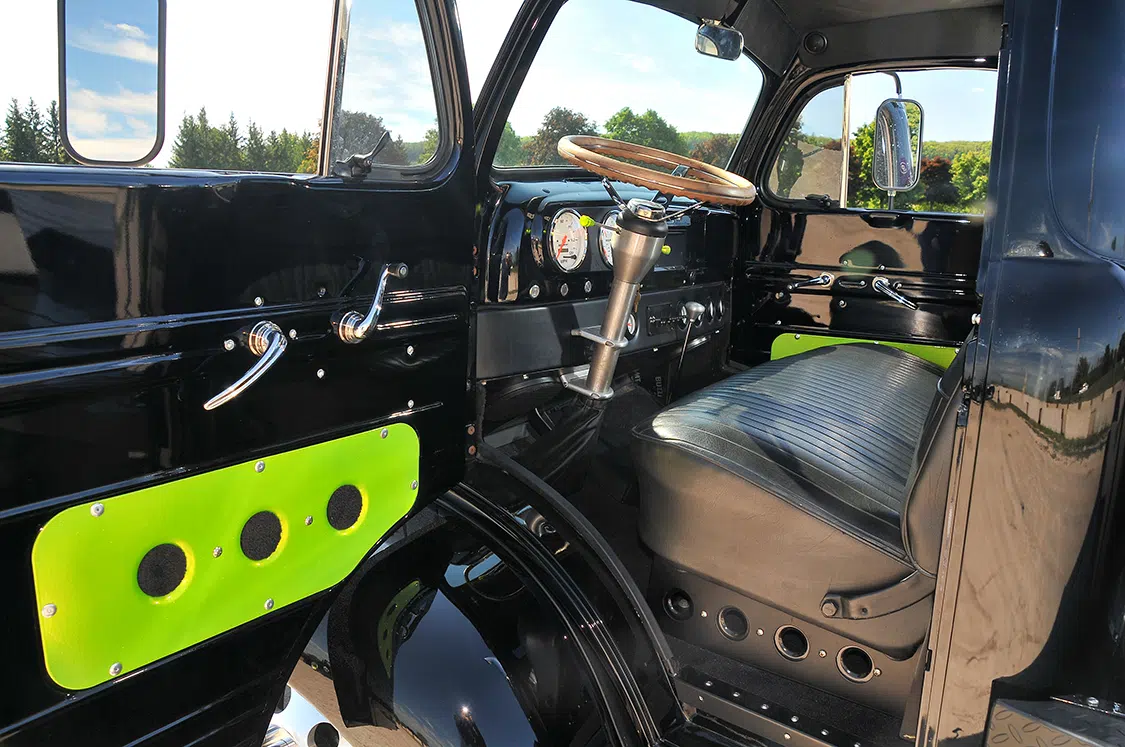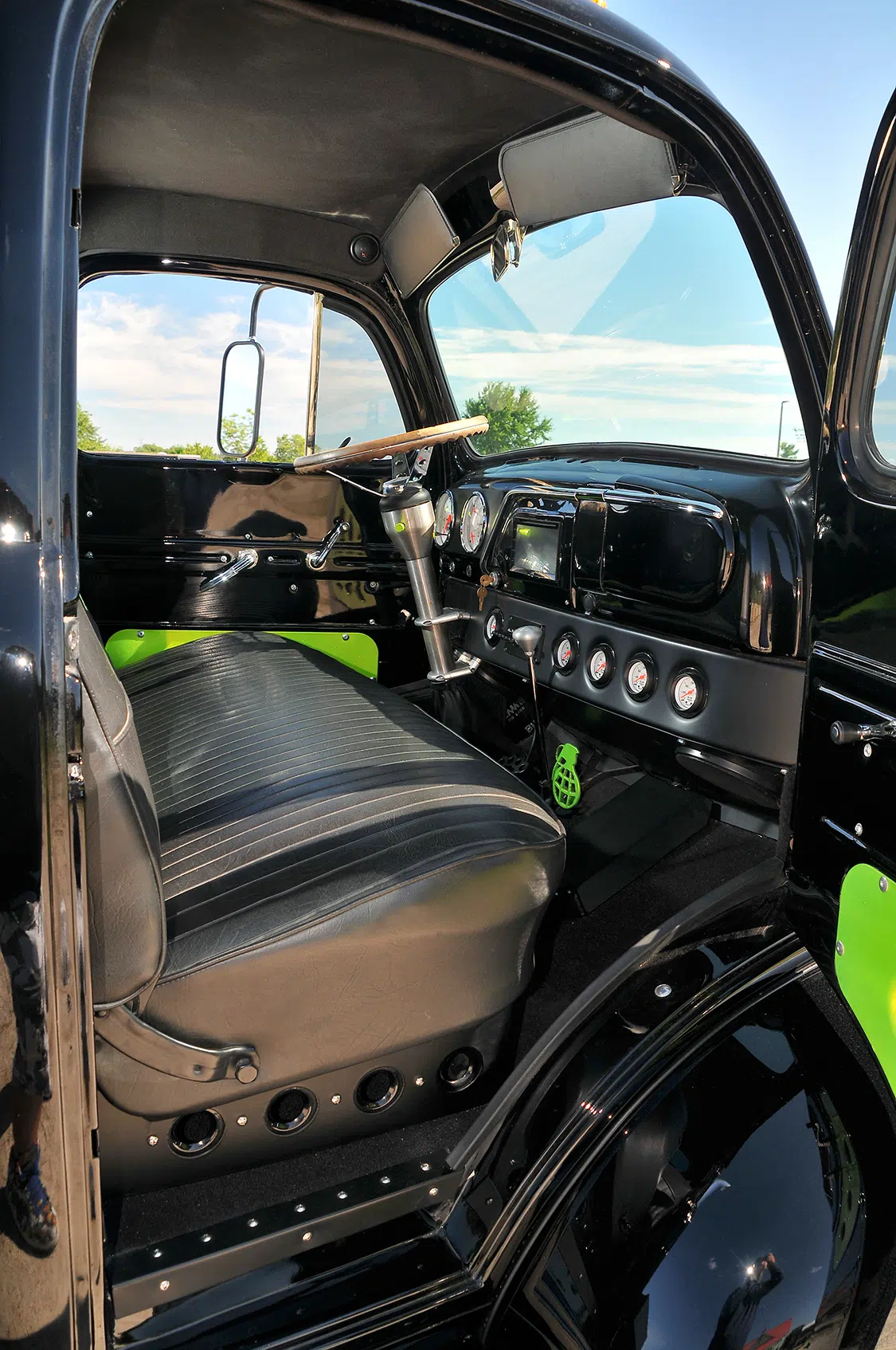 With the Dodge completed and ready to show at events, Troy realized that driving this smaller Dodge wouldn’t be an easy thing for the crew. Troy’s dad, Rob, knew of a friend who had a cab of an old ’52 Ford COE, which stands for Cab Over Engine. Being that it was just a cab and not a chassis, Troy knew his work was cut out for him. The first step was making sure the engine was solid, so the team at TLD used a bare-naked Ford chassis and found a 7.3L Powerstroke diesel engine. Troy cut out a section of the floor and firewall to mount and accept the cab onto the chassis. Once it was completed, they realized the motor was much too large for the area, so Rob recommended the motor be added to the middle of the chassis behind the cab. Custom motor mounts had to be built to make this design work.