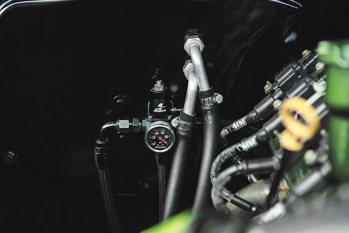 “The truck originally came with a 305 and a 3-on-the-tree, but that just wasn’t going to cut it”, Wesley says proudly. “The first swap was to a 383 Stroker controlled by a Holley Sniper unit. That was eventually yanked for a 2009 LS from a Yukon I bought from eBay. I did some work to it and drove it approximately 300 miles before I sent the piston through the side of the block. Lesson learned—leave the engine work to the professionals. I then reached out to local race shop Krings Motorsports to build another 6.2L LS with all new internals, while reusing the heads and cam from the other LS.”
