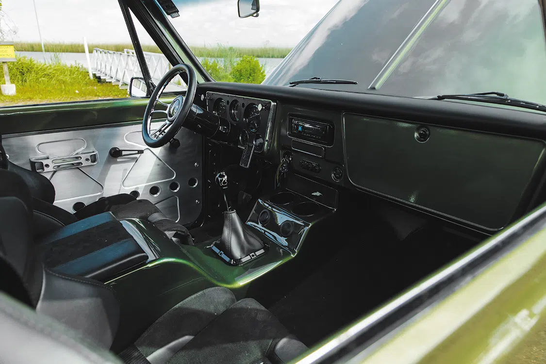 Next up was some much-needed paintwork, which Wesley and his daughter Kristina tackled together. Eastwood’s Shaggin’ Green Metallic paint proved to be a great color selection and was good enough to be utilized inside the cab as well. A one-off center console and bead-rolled, dimple-die door panels designed by Wesley and fabricated in collaboration with Bill Dieterich of Kustom Design Innovations make a huge statement inside of the cab. There’s a slick, utilitarian vibe going on within the confines of the C10, and it just has to be said that it looks cool as hell.