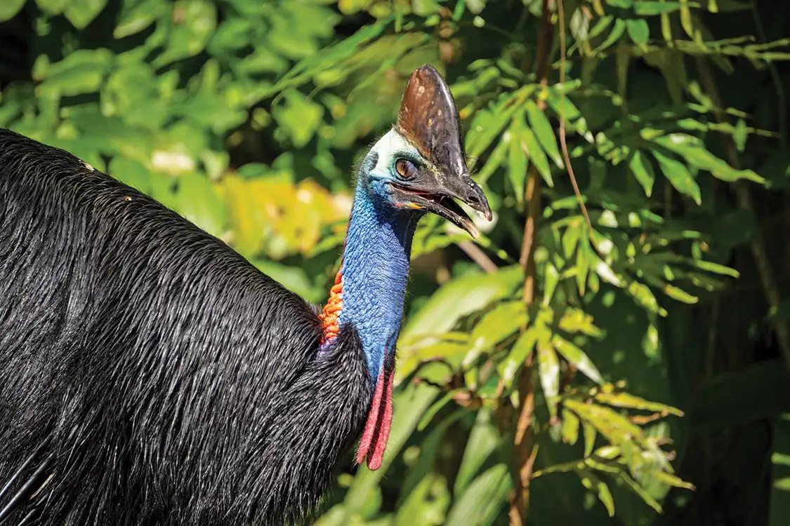 The Daintree is also home to thousands of animal species, including the majestic cassowary. This flightless bird is roughly equal in shape and size to an emu or ostrich, and its striking neck is decorated with bright iridescent blue, red, and orange feathers. While cassowaries are typically wary of humans, they can get very aggressive when provoked or defending young. Their three-towed feet have large claws that resemble a velociraptor, making me wonder if we may actually see a dinosaur wander by. Cassowaries have been known to kill humans, leading to the label of ‘World’s Most Dangerous Bird.’