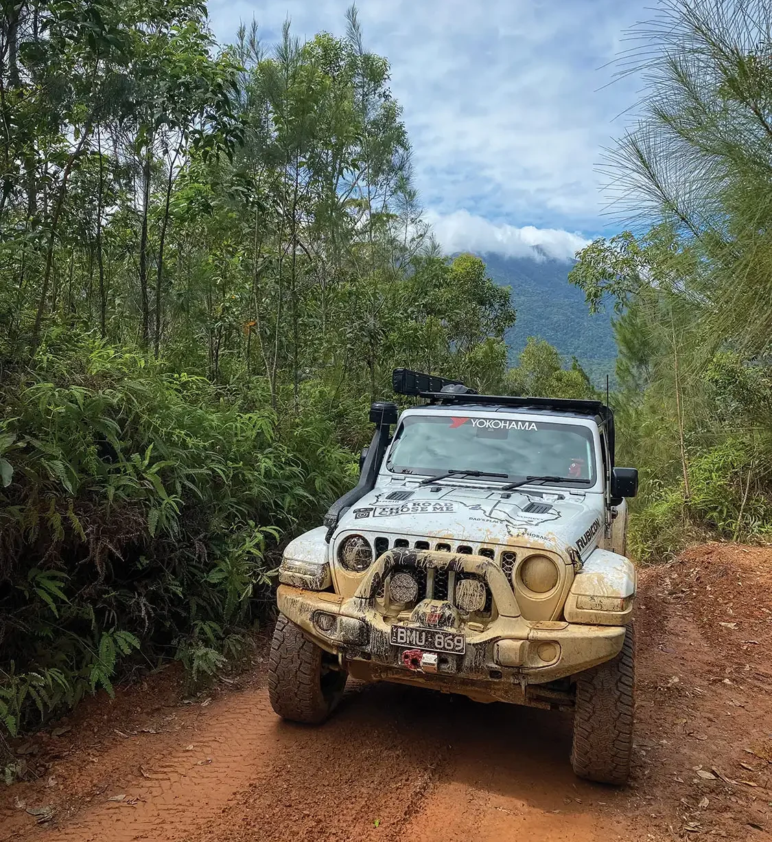 Early on the track we navigate a series of small mud holes, washouts and soggy low-lying areas before we begin to climb in earnest. Simultaneously, the jungle closes in on all sides until we’re completely surrounded by the dense green foliage.