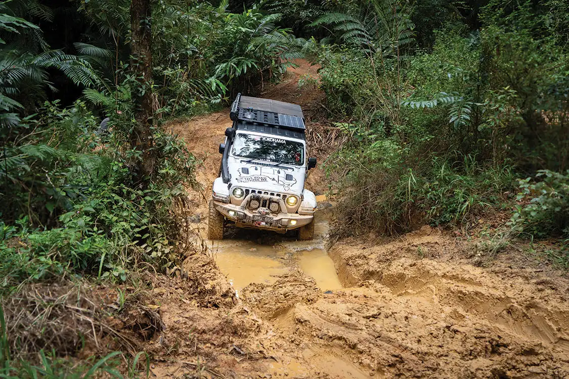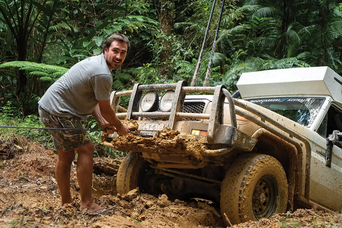 After enjoying the stunning views from the lookout at the track summit, we make our way down the backside of the mountain, avoiding the worst of the deep washouts. We cross a few small rivers and slash up some mud here and there, but don’t encounter anything to really slow our progress. As we arrive at a much bigger creek crossing, however, I sense things are about to get exciting. There isn’t much water in the creek, though it’s obvious the bottom and far bank are pure thick mud. The bank on the far side is very steep, leading us to dig out winch controllers, shackles and tree protectors before even attempting it.