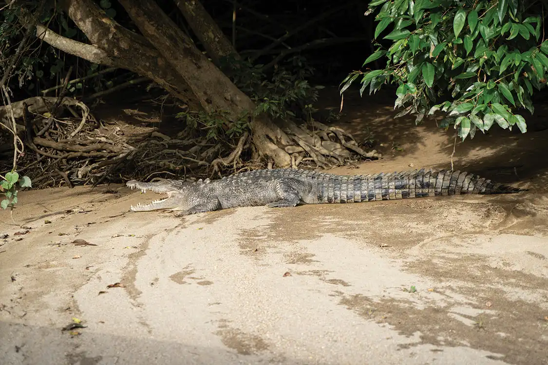 After meeting at a stunning campground elevated above the Daintree, we set off downriver on a croc tour. In less than thirty seconds, we spot the resident alpha male sunning himself on the bank and get a huge laugh when Canadian Katie doesn’t see the massive reptile with mouth wide open until we can almost reach out of the boat and touch it. While she’s good at spotting bears, we all agree she wouldn’t last too long against Australian critters. Over the next hour, as we meander downstream, we see a handful more of the large reptiles in and out of the water. Seeing a large female swim under the boat without making so much as a ripple is an eerie experience.
