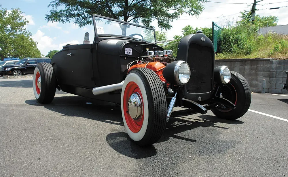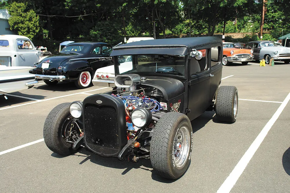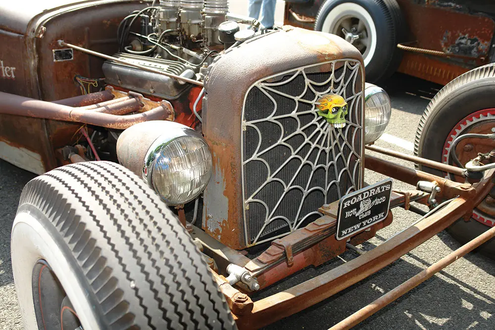 On Saturday, I got my ’62 T-Bird ready for the Road Devils 4th Annual Peel Out, held in a parking lot in South Orange, New Jersey. This is a hot rod show, more accurately, rat rod show. There are no trailer queens here, just the backyard-welded, handmade, knuckle-busted, blood and guts hot rods and customs whose only set of rules is to keep it real. These rods are raw, loud, beasts with imagination, humor and the ingenuity to make a vehicle out of junked parts. They don’t take themselves too seriously, with flat rattle-can black or rust being the finish of choice, and skulls, pin-up girls and spiderwebs the standard motif. I donned the appropriate apparel: black muscle-tee, jeans, and black shoes and drove up in my black car with left arm hanging out the door to show off my newly-minted pin-up tattoo, and my entry was assured. I handed the guy at the gate $10 and he looked over the Bird, nodded and said: “Cool”.  My car was one of three cars at this show that actually had shiny paint (but it was accepted anyway).
