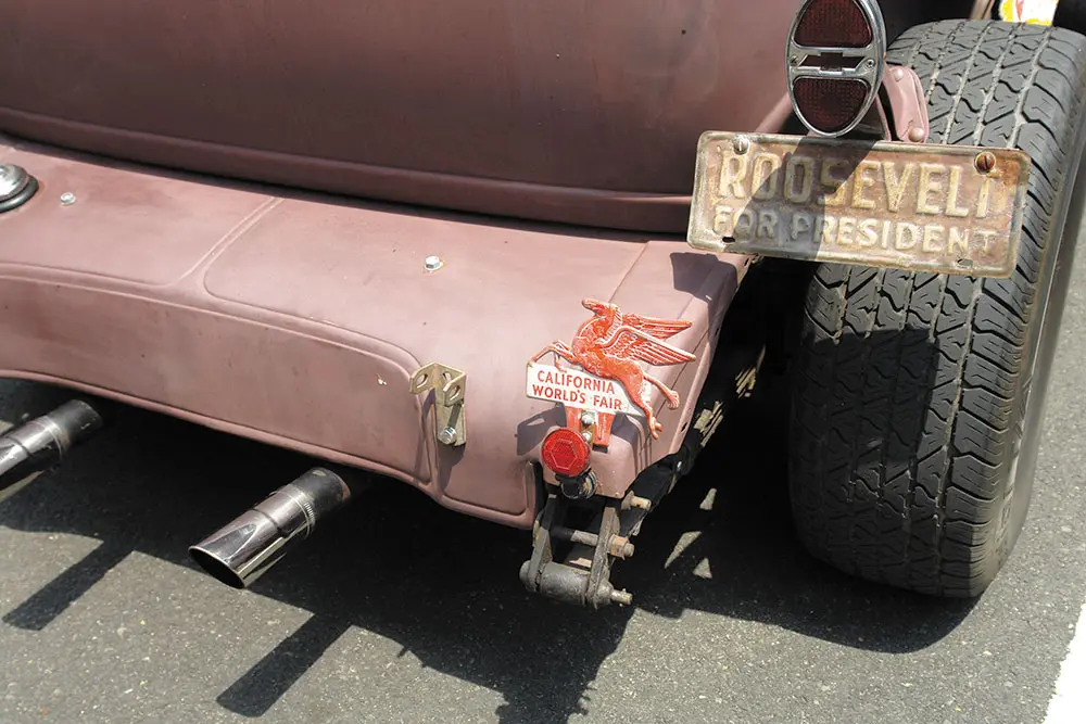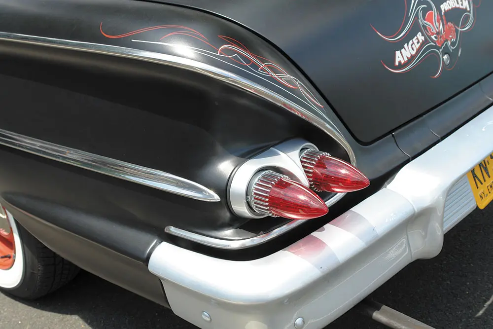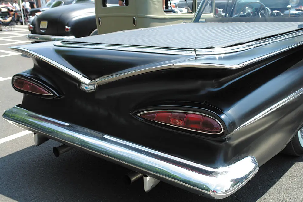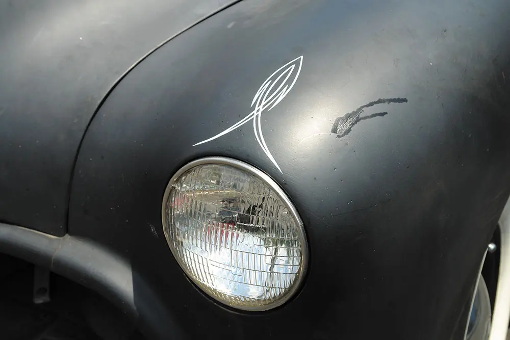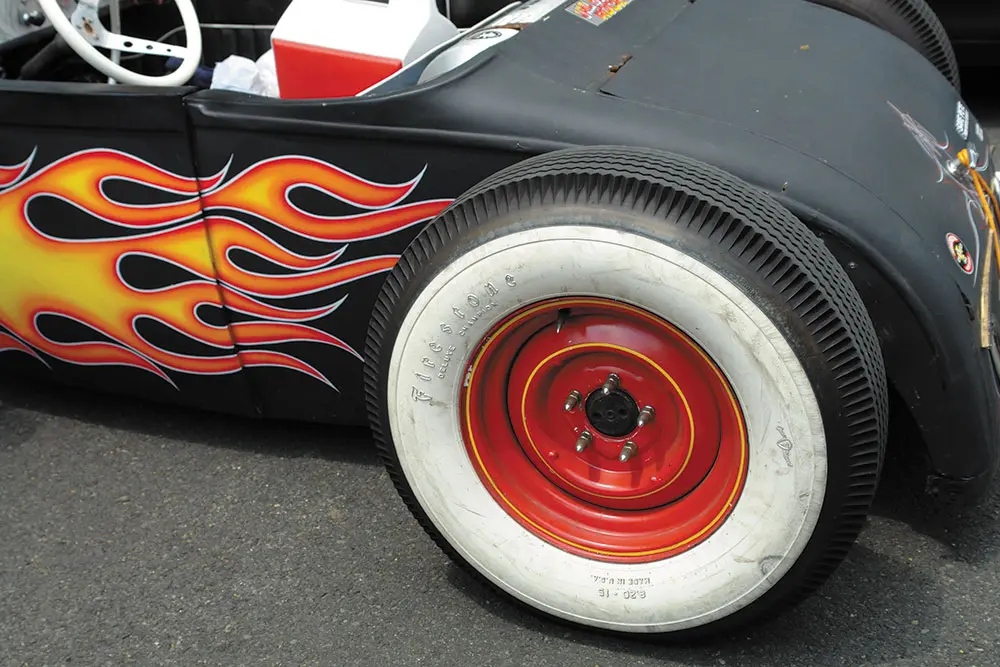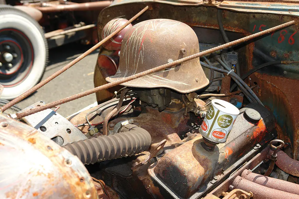 A live Rockabilly band was starting to play and they seemed pretty good, but the oppressive heat was beginning to take its toll. At nearly 99 degrees and  the unrelenting sun, the blacktop parking lot was like a giant frying pan cooking all the black clothing, black cars and black ink tattoos to the point where I thought the cars might just start spontaneously exploding. Despite the trappings of Kar Kulture: the black muscle tees, the ’50s hairdos, the tattoos, you have to admire the fact that these cars are the real deal. These are not expensive retro fiberglass kit bodies attached to modern drivetrains by expensive restoration shops and trailered to the show… No, these rods are torched from steel junkyard parts and welded together with minimum cash outlay. There’s nothing comfortable about them. They are raw, nasty and edgy but they are the real thing, just the way rods were built in the ’40s and ’50s. The same materials, the same sweat, same blood, and same convictions.