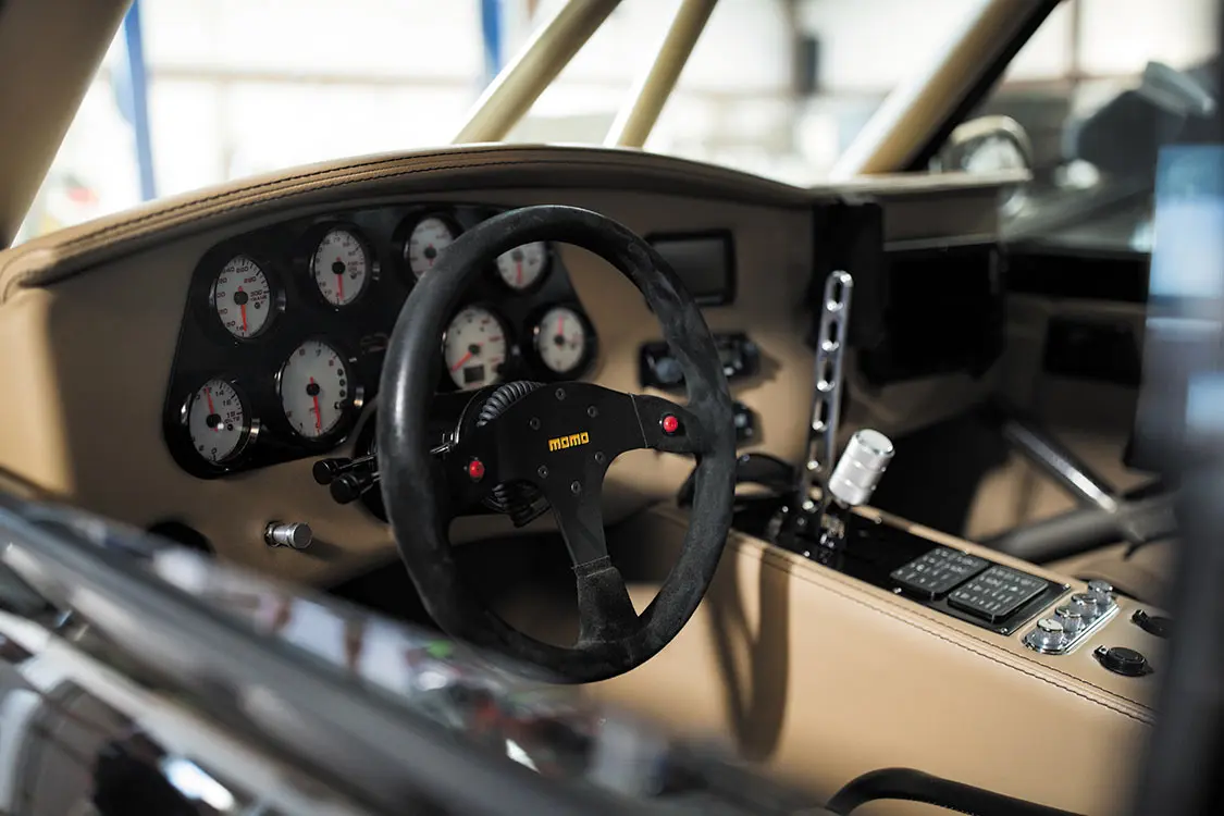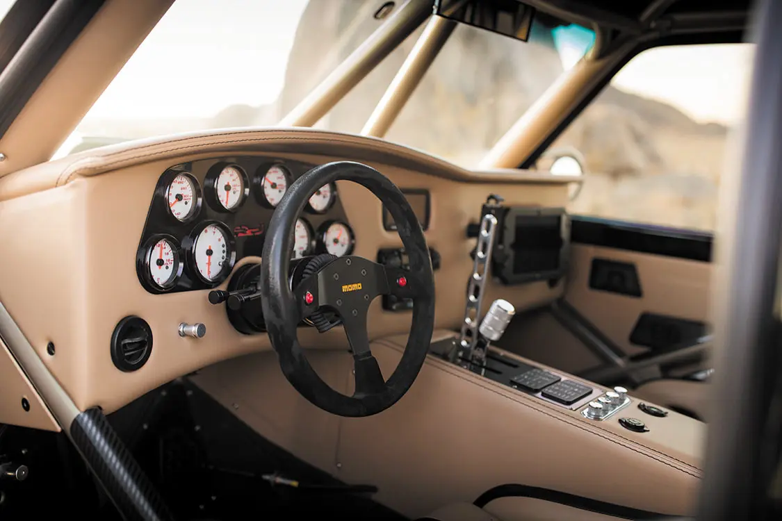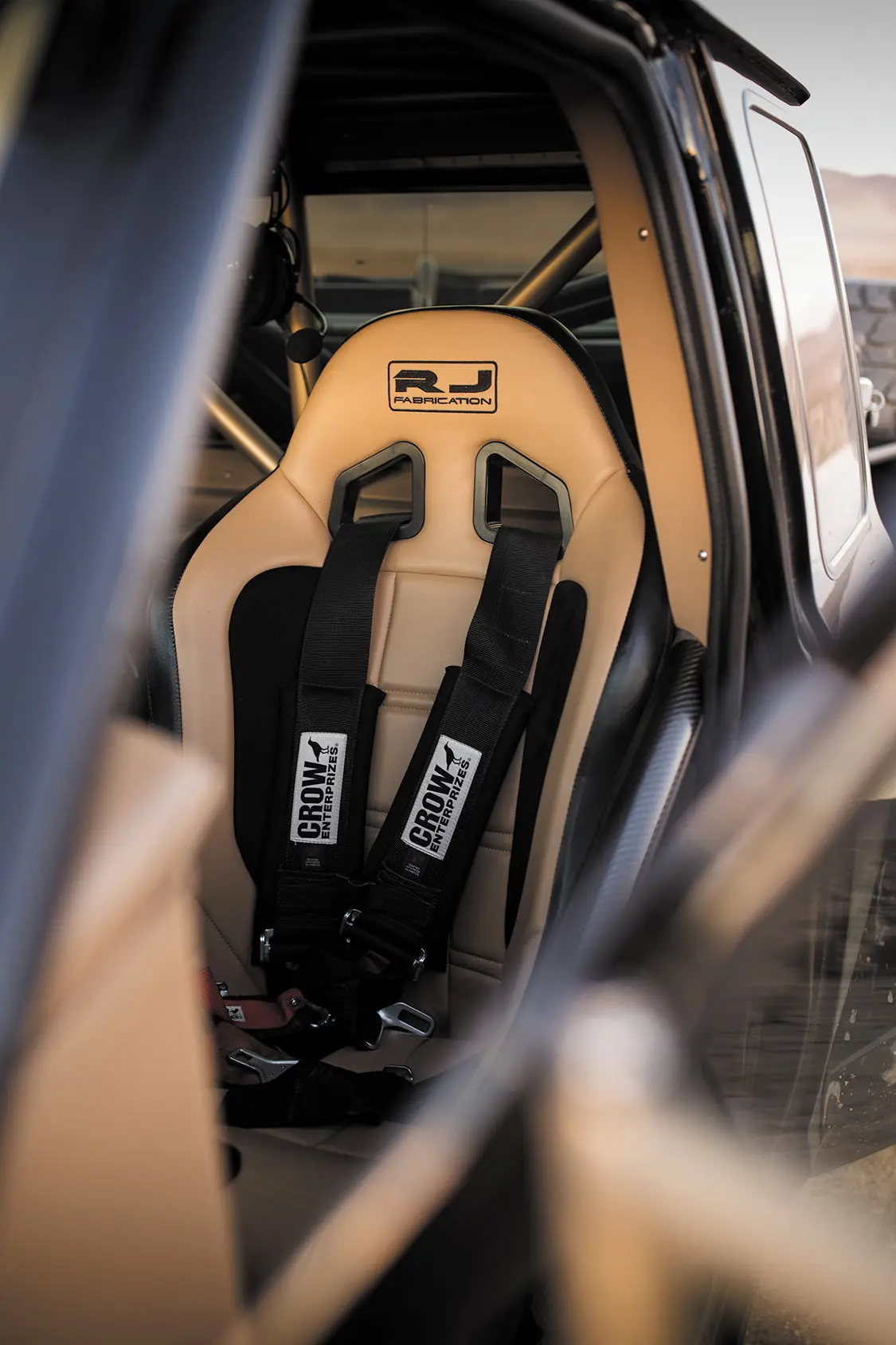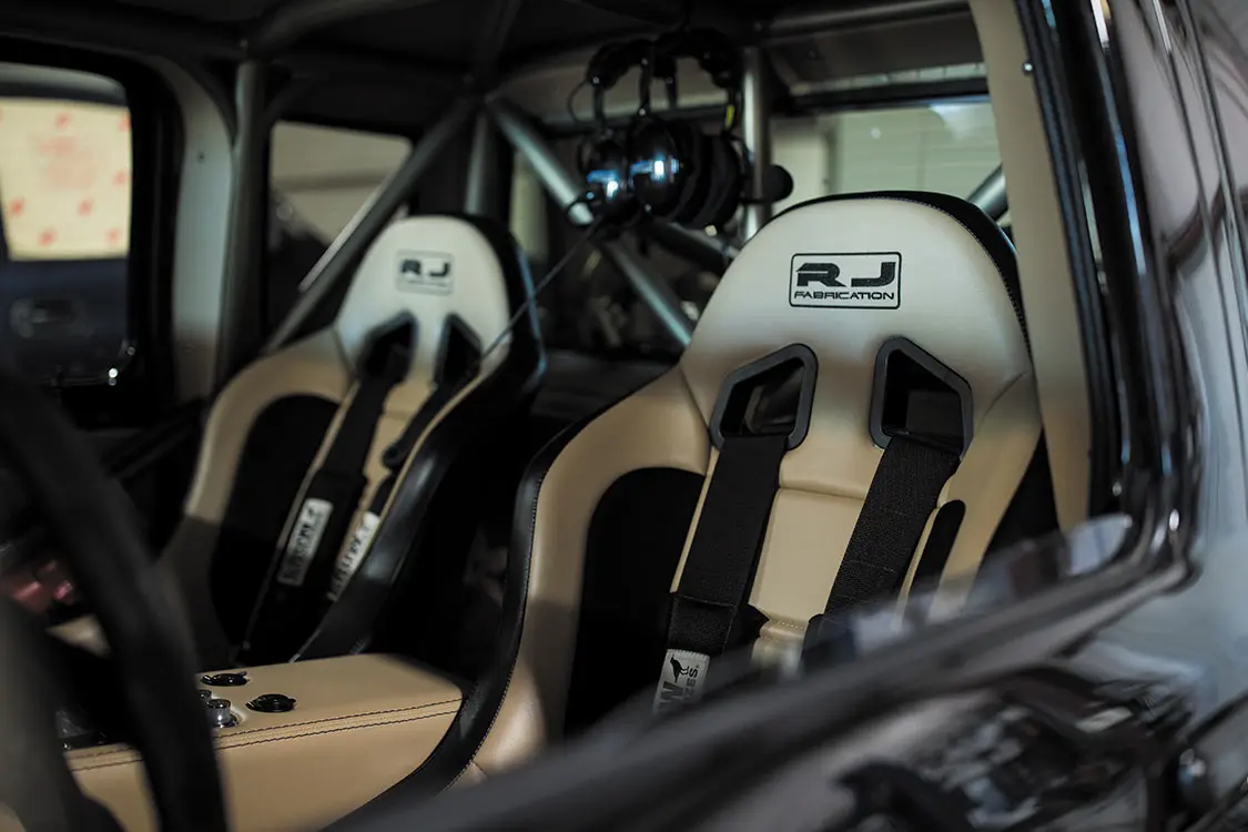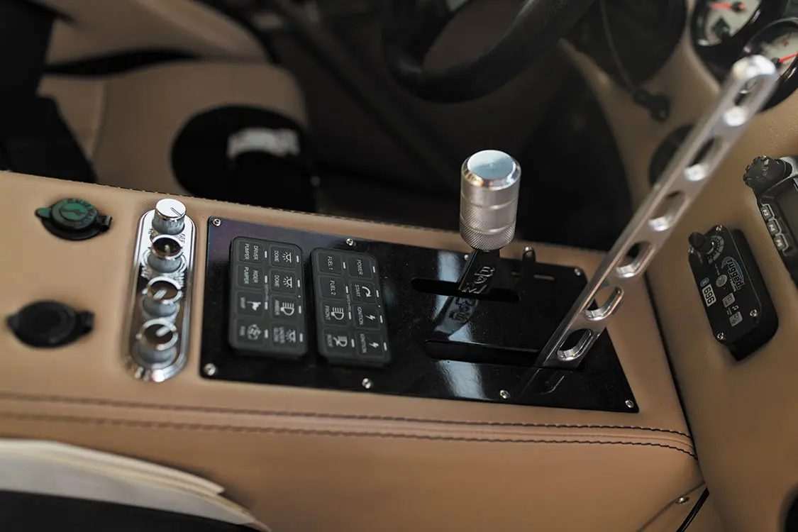 Interior & Stereo: PRP Podium seats covered in beige marine-grade vinyl by Rudy’s Custom Upholstery; Crow Safety Gear harnesses; Custom aluminum dash, center console and panels built by RJ Fabrication and covered by Rudy’s Custom Upholstery; Custom RJ Fabrication 2-inch chromoly rollcage; Speedhut and Fuel Air Spark Technology gauges; MOMO steering wheel; Rugged Radios push-button communication system with AlphaBass headsets