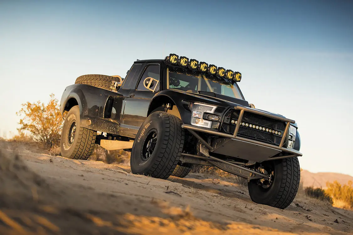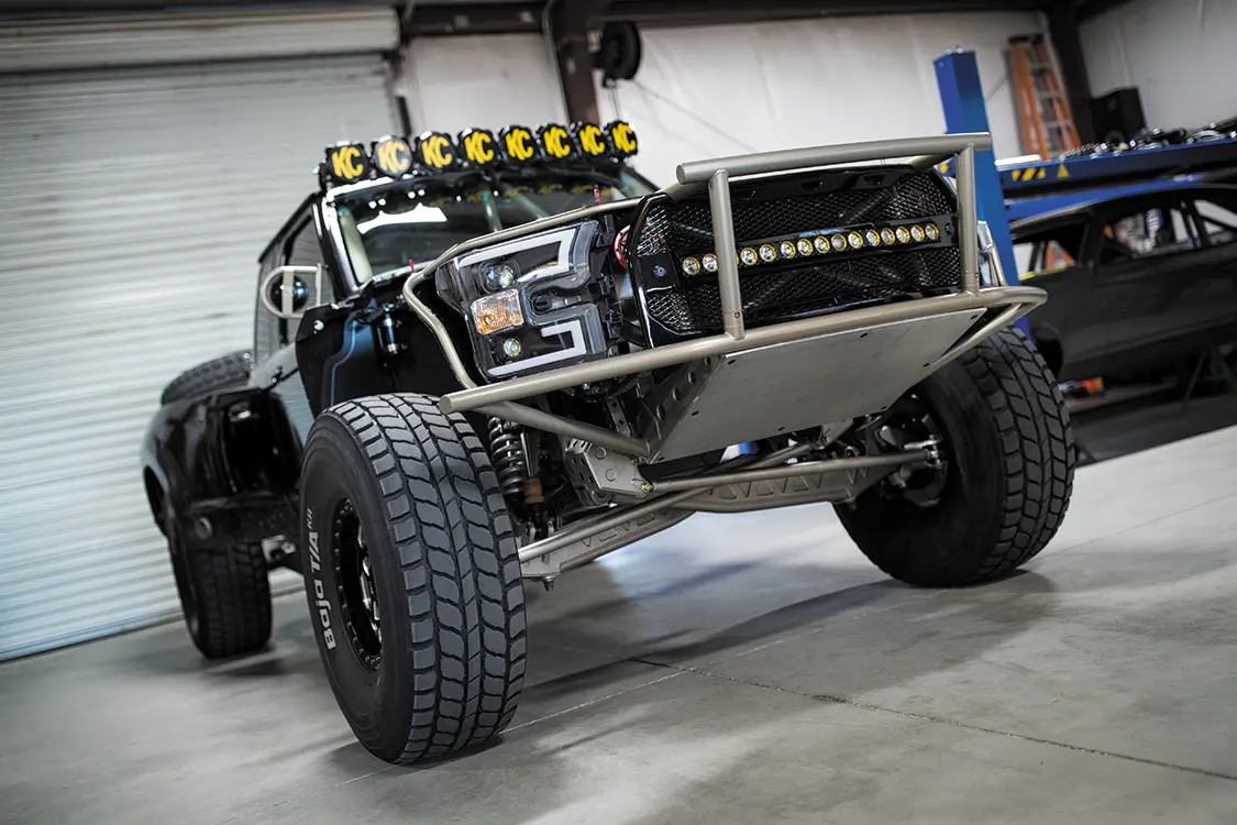 Body & Paint: Modified McNeil Racing front clip; Modified McQueen fiberglass fenders and bedsides; McNeil Racing fiberglass grille; McNeil Racing fiberglass hood; Custom bumpers by RJ Fabrication; Raptor headlights; KC secondary lights; Custom skid plate; Laser-cut rear cage details from Western Fabrication; Dupont black paint sprayed by Mike Doman of Doman Auto Body