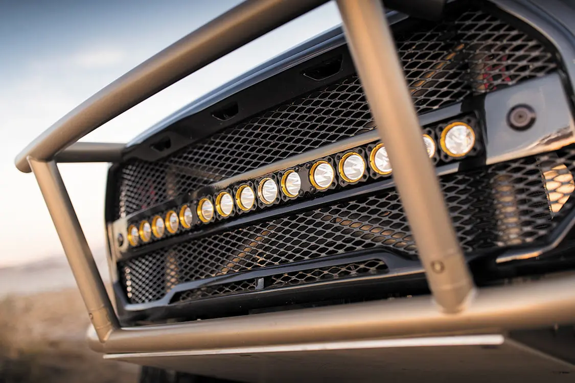 For lighting, Rob opted to go with Raptor headlights, while adding KC lights above the cab, as well as a light bar in the front grille for optimal illumination on dark back roads and night-time desert treks. The entire truck was then sprayed in Dupont black for a sleek finish by Mike Doman of Doman Auto Body, and topped with laser-cut rear cage details from Western Fabrication.