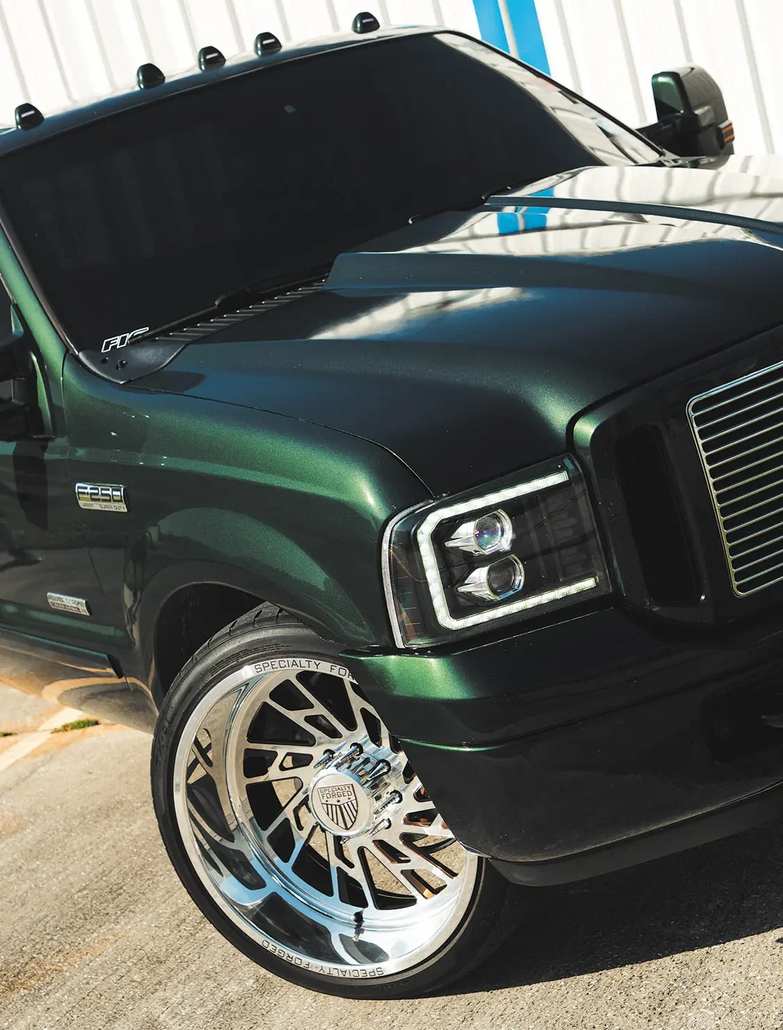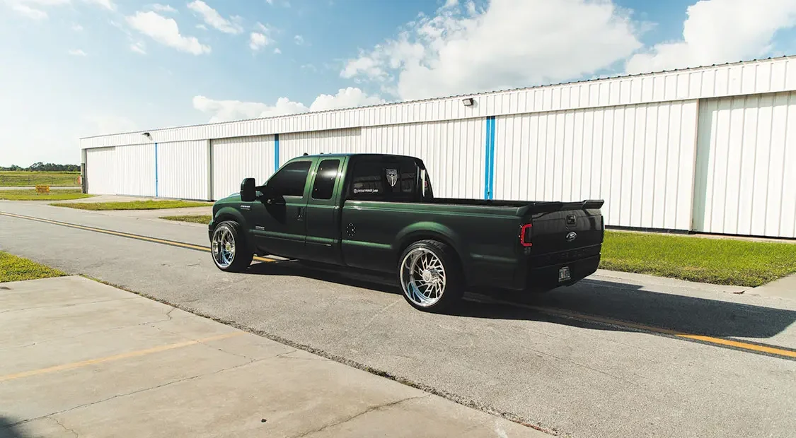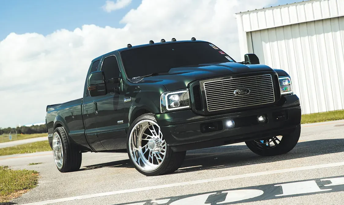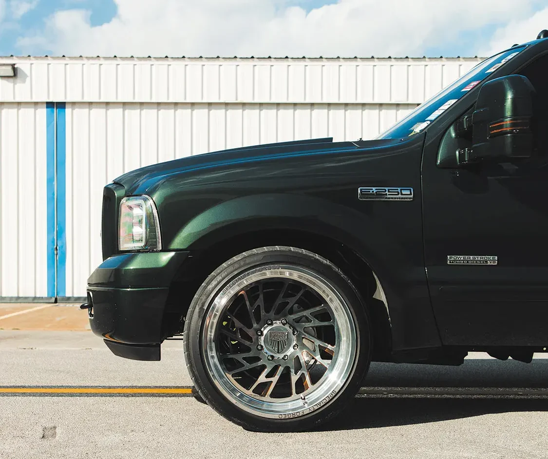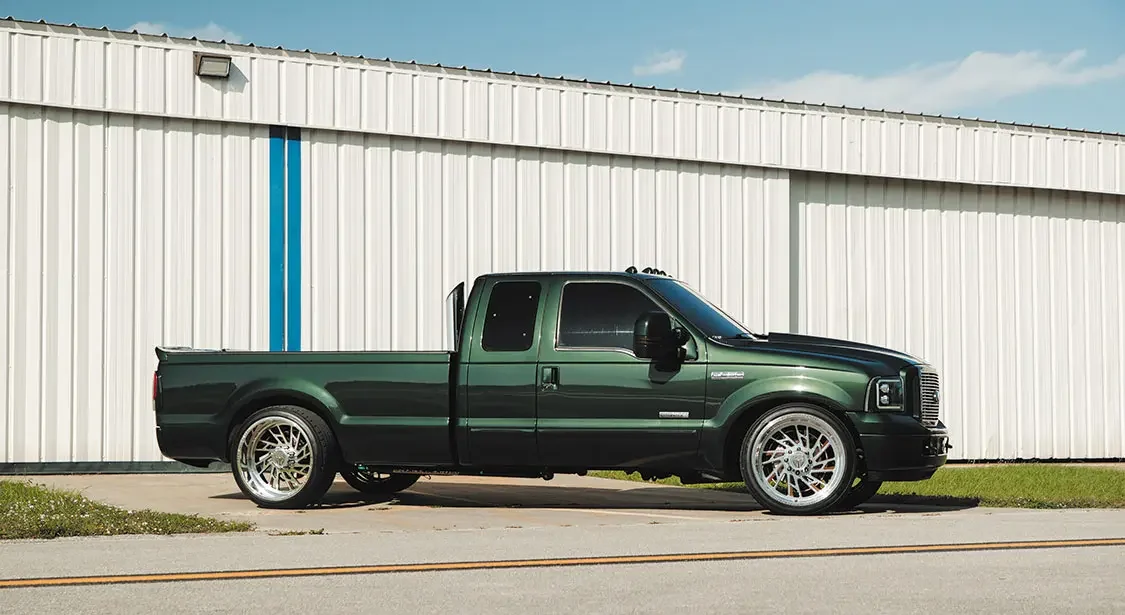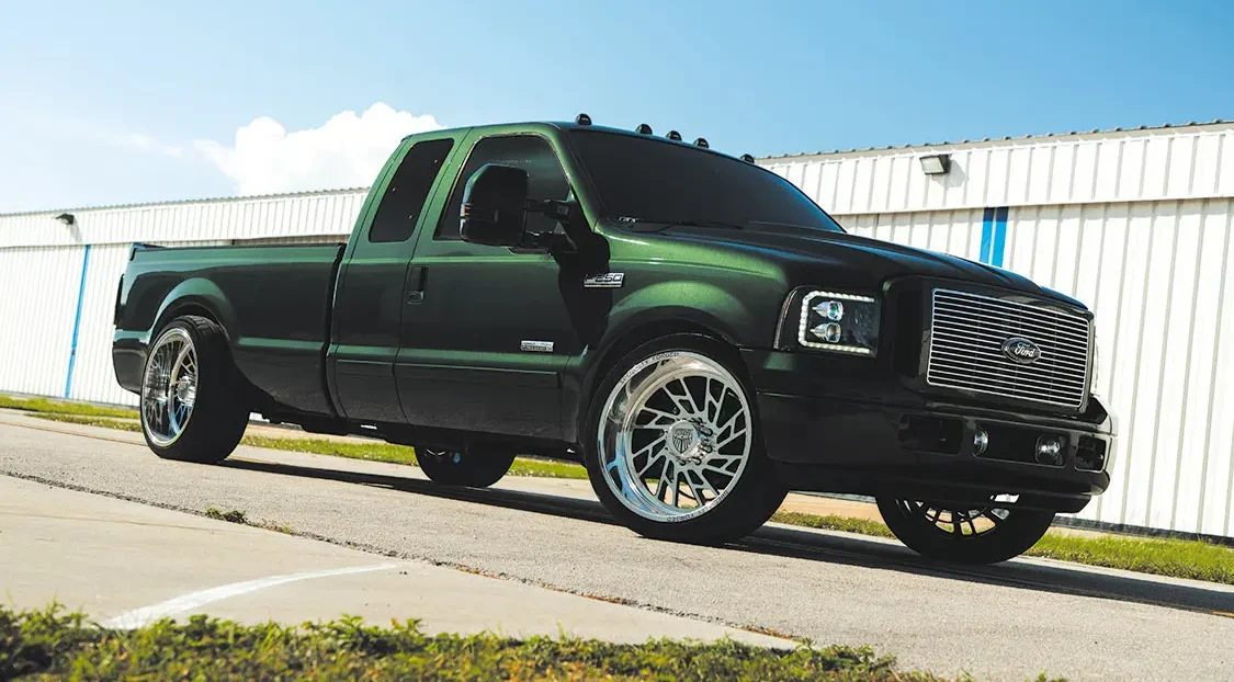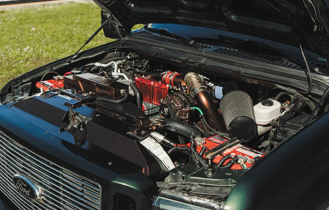 Once the Ford was mechanically sound, David could then start on the cosmetic issues. The first modification was lowering the front end down 4 inches and 1.5 inches at the rear. Next, a set of 24×12 Specialty Forged wheels, a 2005 front end, and color-matched exterior trim were applied, and the entire truck was resprayed with factory Highland Green Metallic paint for good measure. The interior space was then upgraded with a brand-new set King Ranch seats from Richmond Upholstery, an F-650 lower dash panel capable of running auxiliary gauges, a US Speedo stainless cluster and various billet pieces, along with a painted dash and trim pieces for a cohesive overhaul throughout the cab.